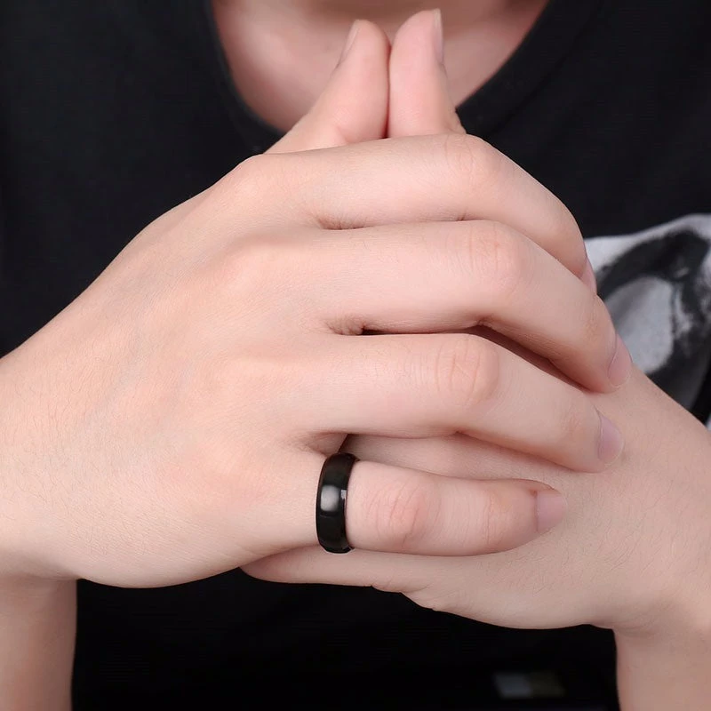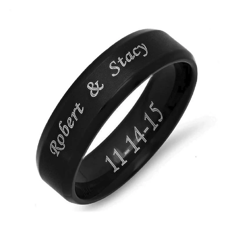 Personalize this classic matte finish ring with something close to your heart. Available in stunning Black with a beveled edge, it can be engraved with you and your partners names, an anniversary date or the text of your choice.