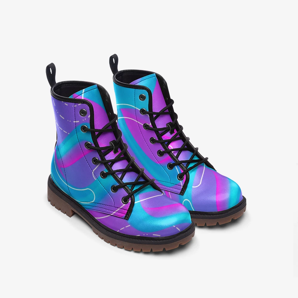 Our Abstract Fluid Lace Up Boots are definitely for extraverts. They feature an all over fluid print in purple and blue.Â