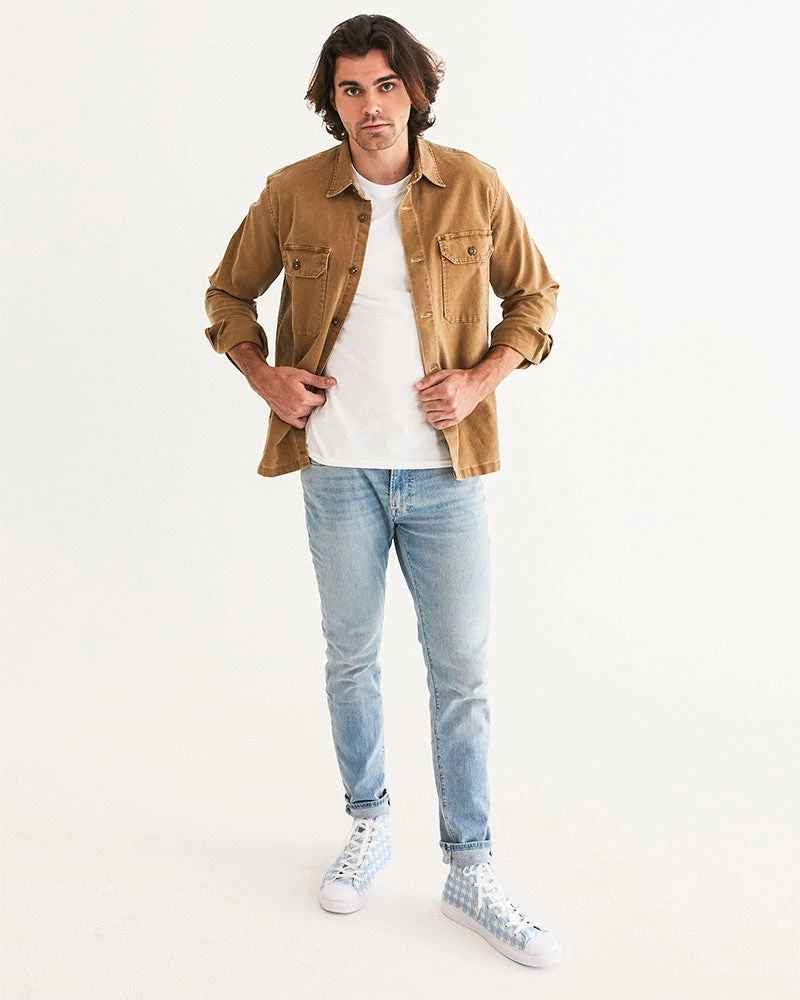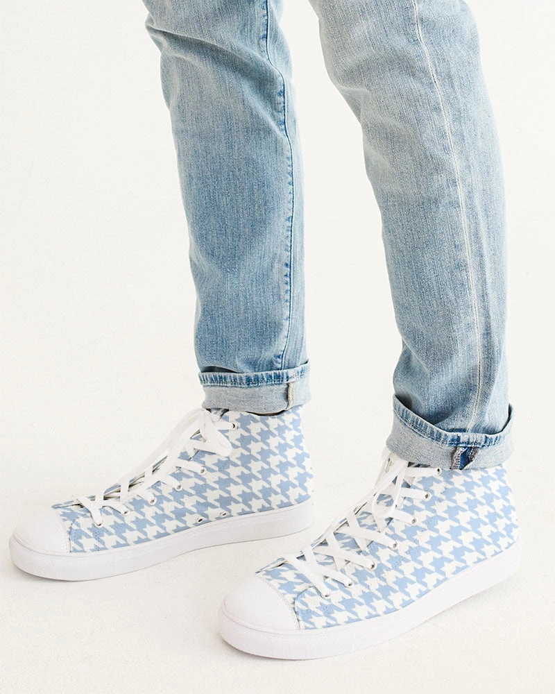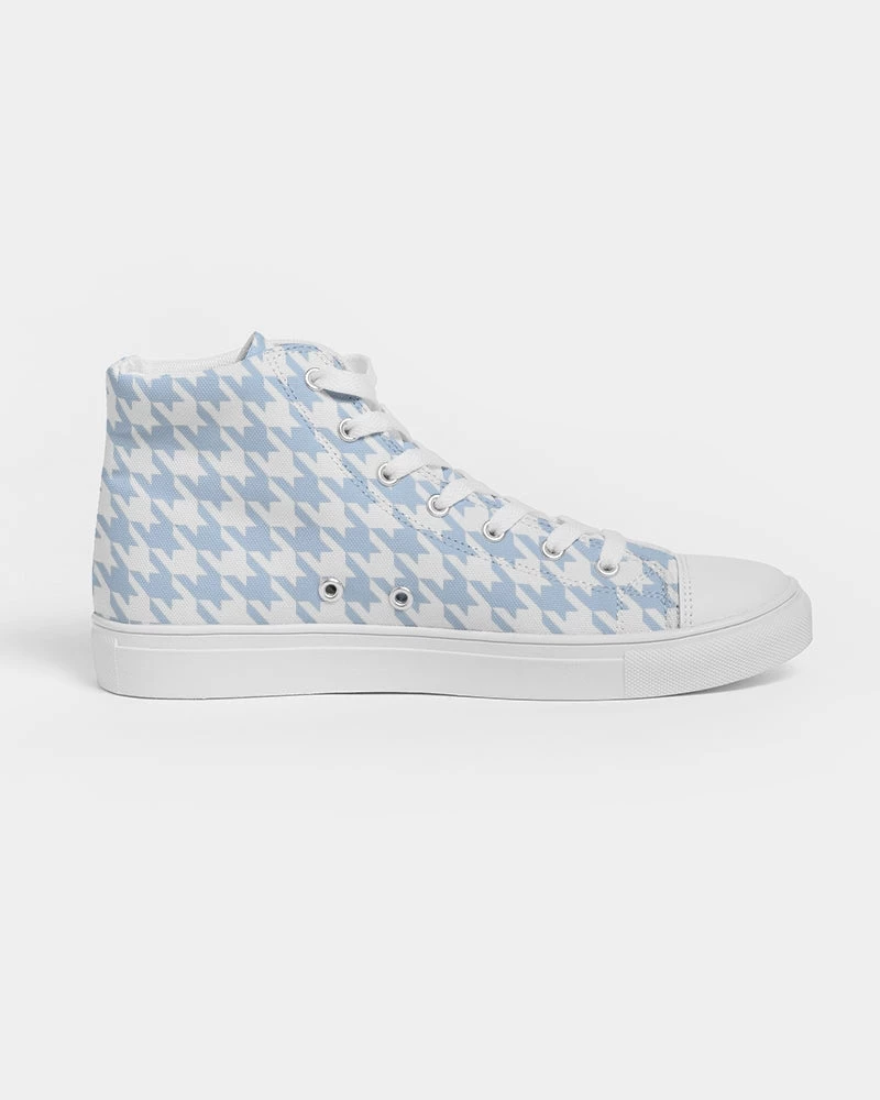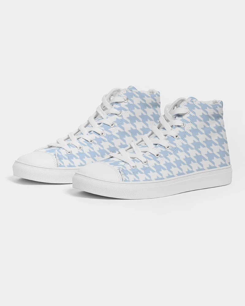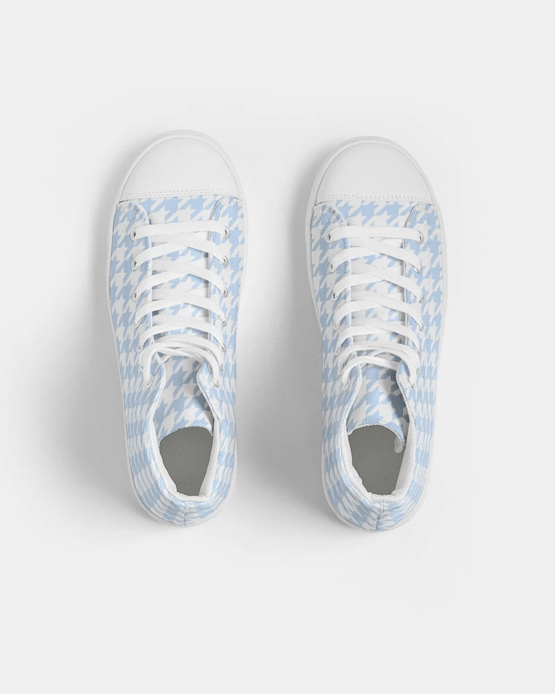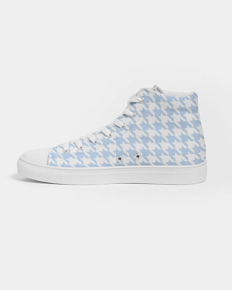 | Our Baby Blue Hightop Canvas shoes feature an all over large houndstooth pattern. Pair with jeans, shorts or pants for any occasion. Our canvas high tops feature a soft insole for all day comfort, and an environmentally friendly vegan leather toe cap.
