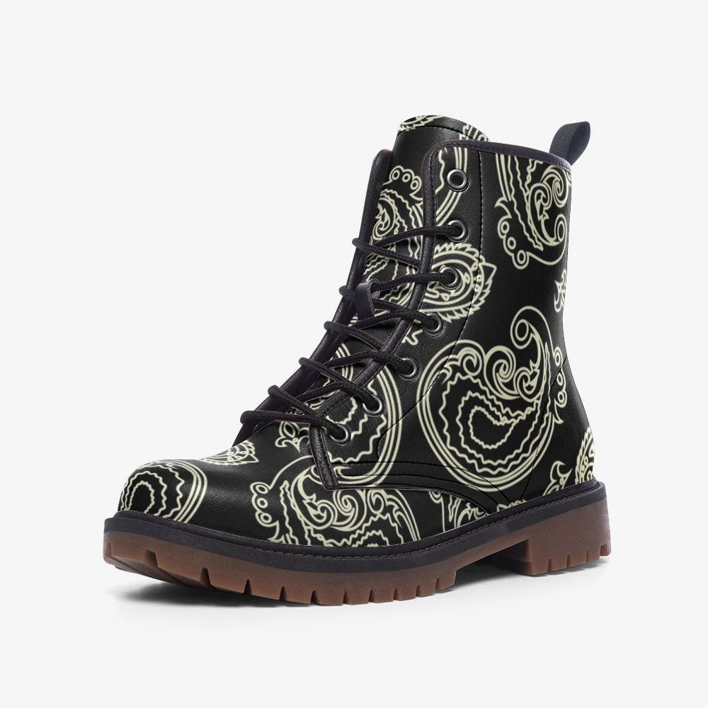Our Black & Bone Paisley Lace Up Boots are bound to make a statement. They feature an all over large paisley pattern in bone cream over black.