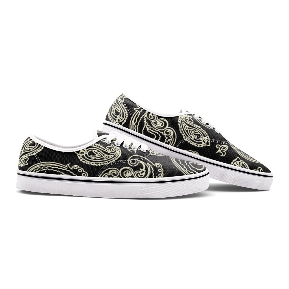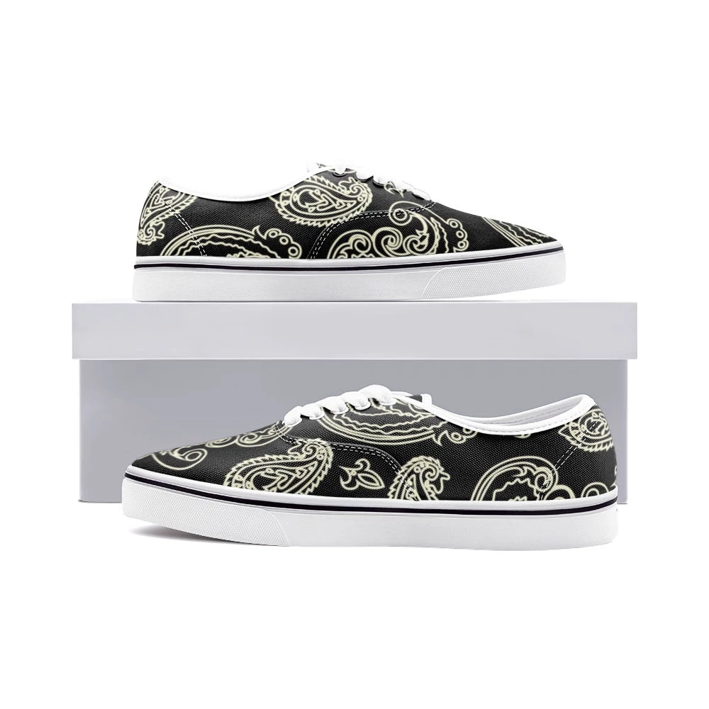 Our Black & Bone Paisley Low Cut Canvas Shoes feature an all over paisley print in black and bone cream.