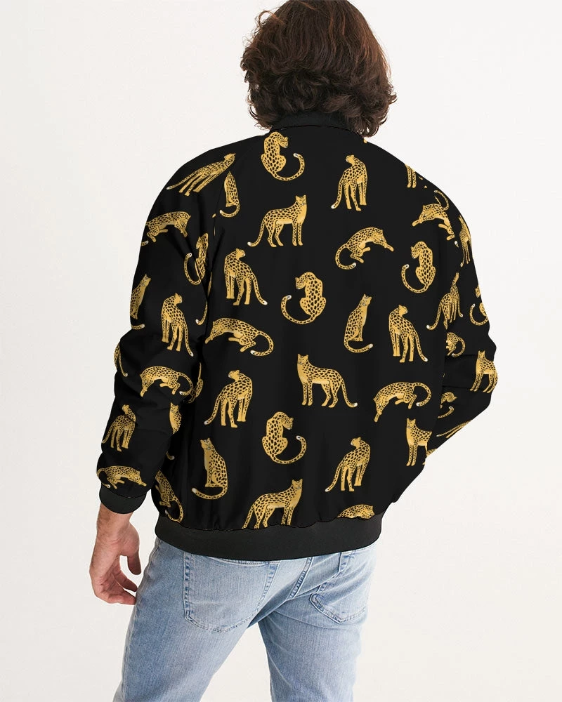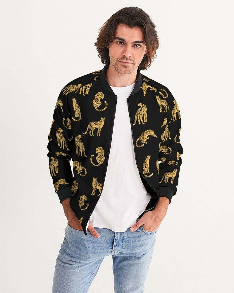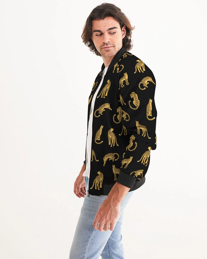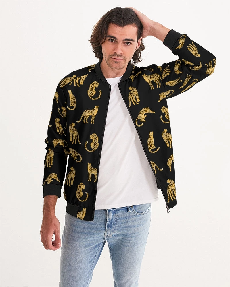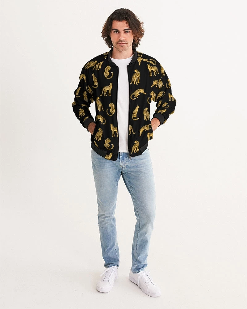 | Hand-cut and crafted with care, our Black Leopards Men’s Bomber Jacket is all style. The lightweight, airy fabric is fully lined for a premium feel. Fully versatile to be worn daily or dressed up for a night on the town. Pairs perfectly with black pants, jeans or or shorts. A designer jacket in an all over leopard pattern over black.Â
