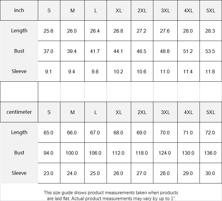 | inch | S | M | L | XL | 2XL | 3XL | 4XL | 5XL |