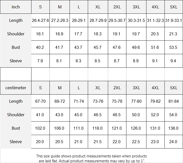 | inch | S | M | L | XL | 2XL | 3XL | 4XL | 5XL |