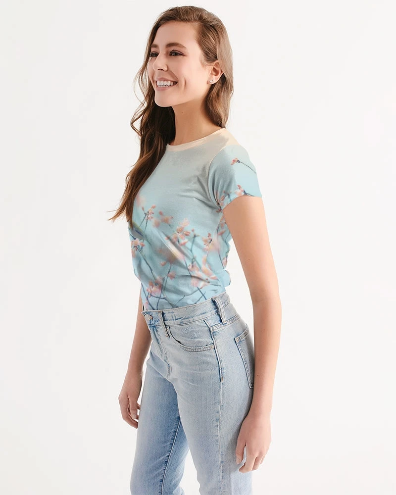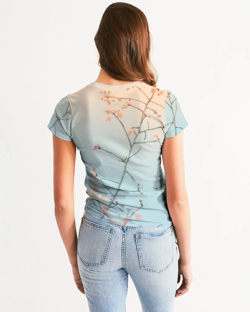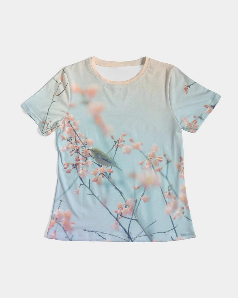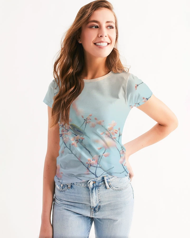 | Our Cherry Blossom with Bird fitted Women’s Tee is a stunning addition to your wardrobe. Offering complete comfort and style, it will provide lift to any outfit. Handmade with premium wear resistant fabric with a gorgeous all over print.
