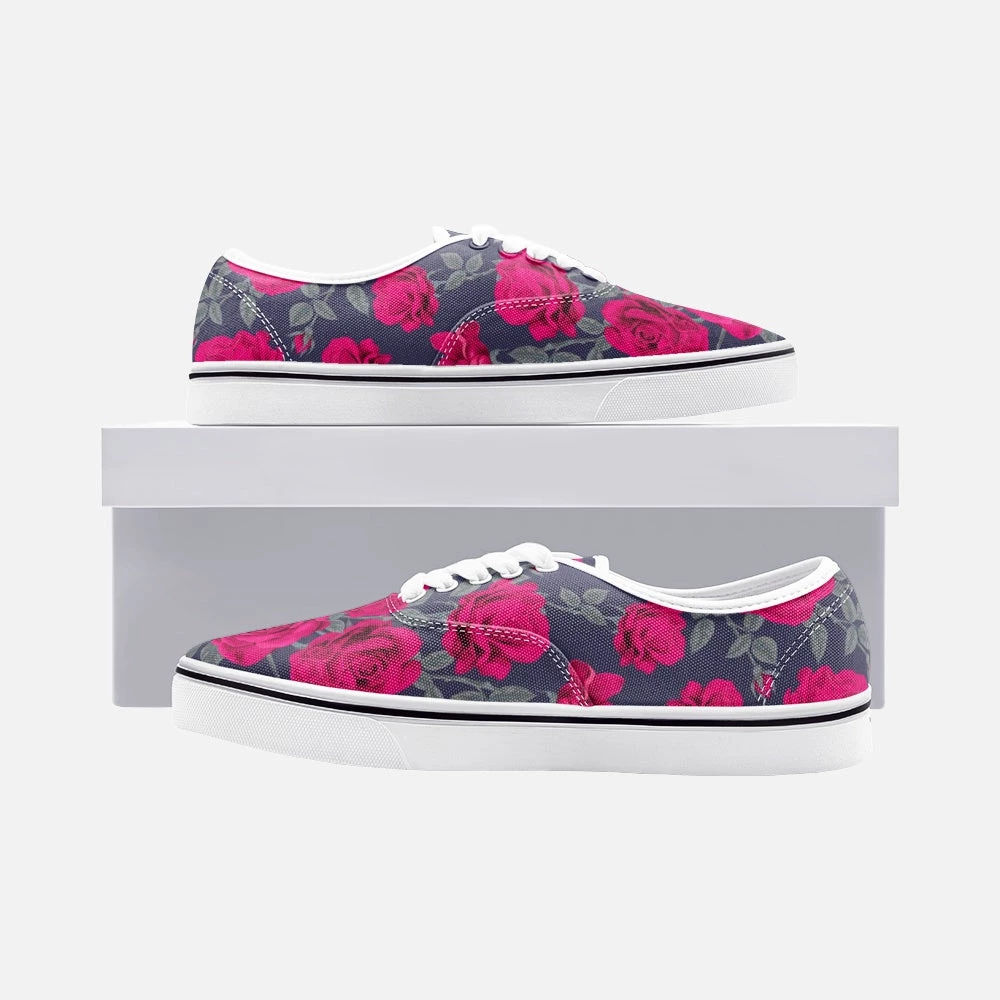Our Dark Vintage Roses Low Cut Canvas Shoes feature a stunning vintage rose design with an all over charcoal blue background.