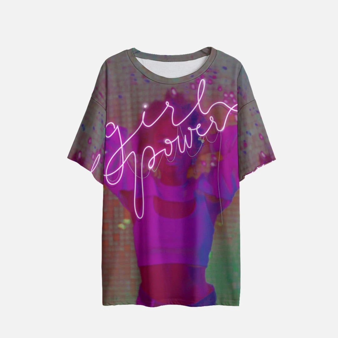 Our Girl Power Drop Shoulder T Shirt features an abstract style print of a woman at a club with a Girl Power neon style sign. This is a drop shoulder design, which you can size up or down, and also knotted / tied up at the front to complete your desired look.