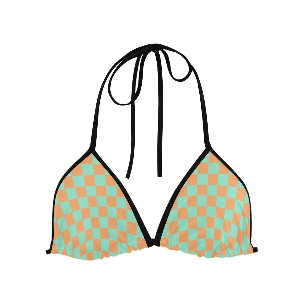 Our Green & Orange Check Bikini Top is super simple and unique. The all over checkerboard print is a great look against your skin tone. This model comes with black tie up straps. Please refer to the size chart for the perfect fit in both EU and US sizes ranging from S through to 5XL.