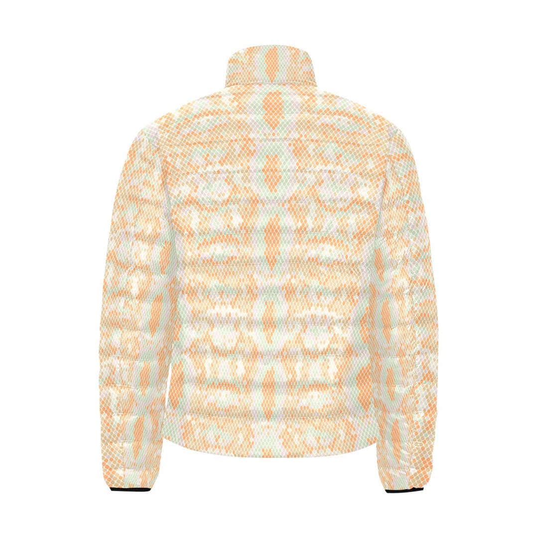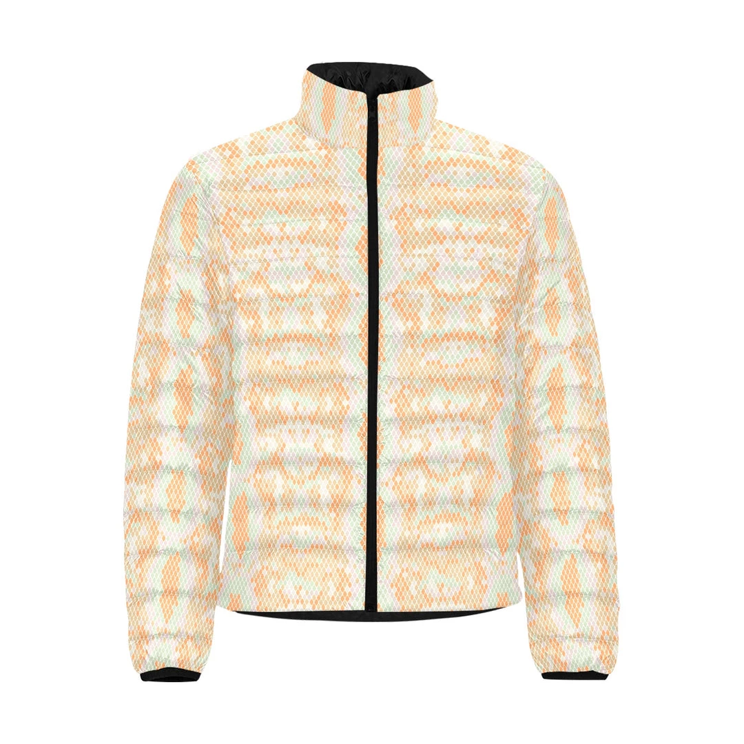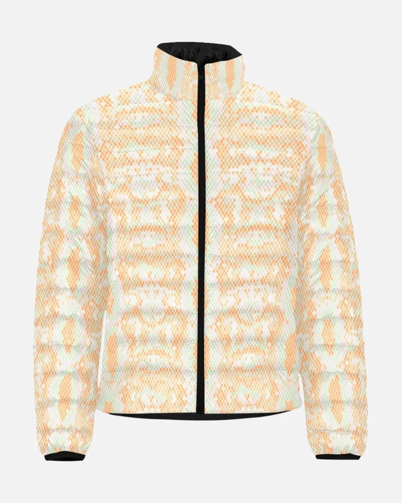 Our Green & Orange Snake Men’s Lightweight Puffer Jacket features a unique all over snake print in green, and orange tones. This unique jacket features quilted material that is warm and lightweight. It has a high collar, strong zipper, elastic cuffs and two pockets.