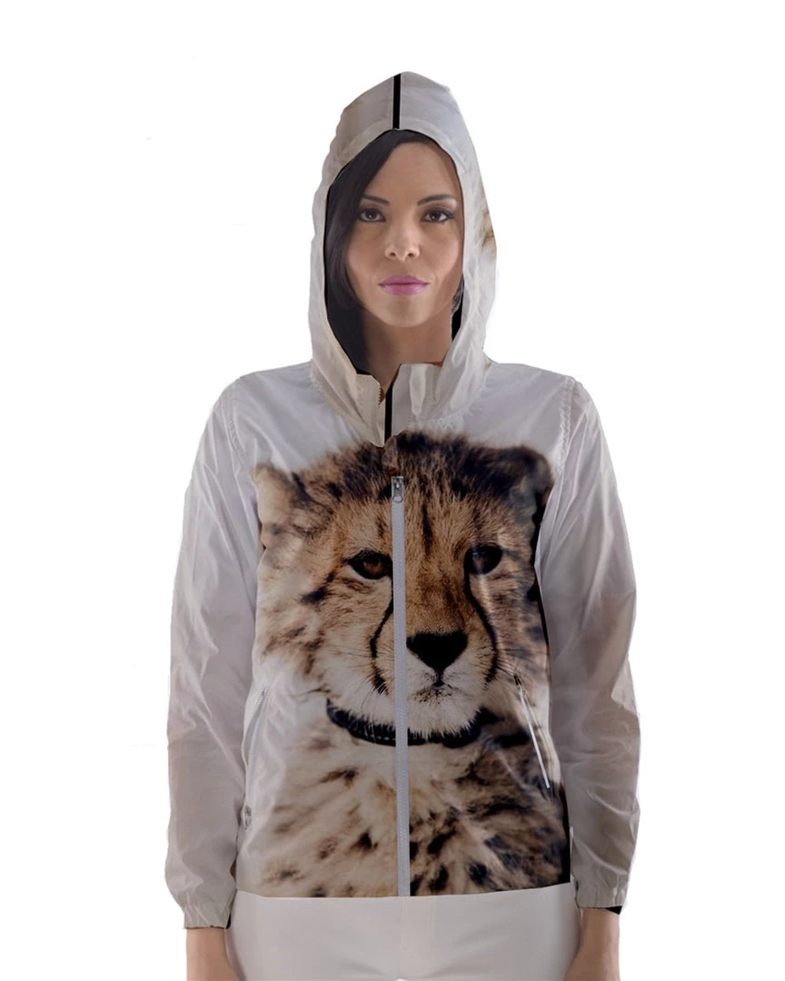 Zip up and stay covered from the elements in our Infant Cheetah Womens Hooded Windbreaker. It features a handsome cheetah on the front with patches of fur on the back and hood. Easy to match with any outfit and great to provide that extra bit of warmth and coverage from rain.