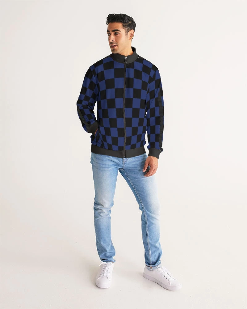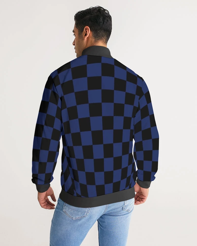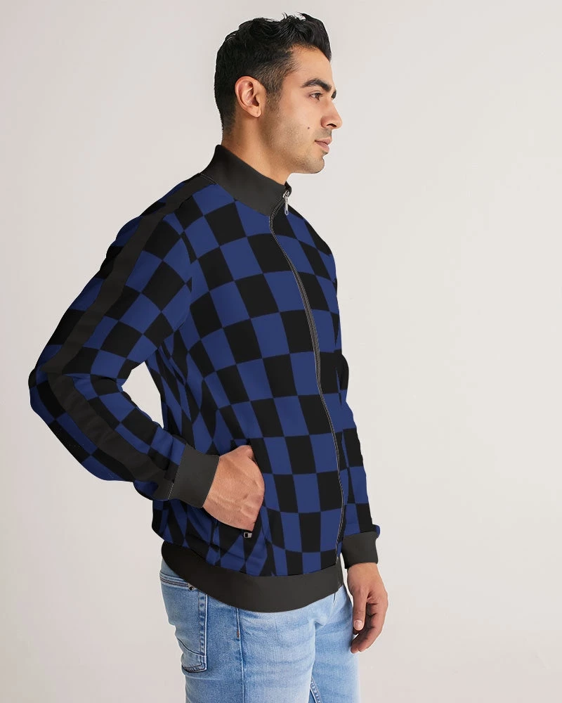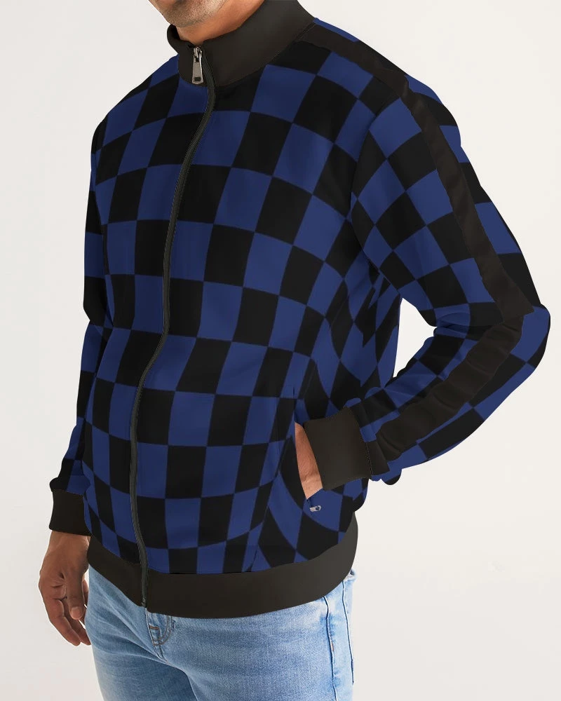 | Our Black & Blue Check Track Jacket will be your daily grab and go. The all over check pattern, high neck zip up ribbed collar, and striped sleeve has a contemporary feel. Perfect jacket for college, a lunch date, or paired with joggers on your way to the gym. A unique black and blue check track jacket to add to your wardrobe.