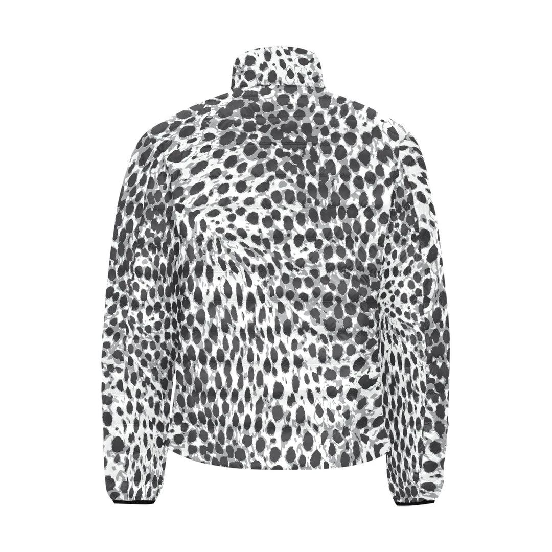 Our Black & White Leopard Men’s Lightweight Puffer Jacket features a striking all over spotted leopard print. This unique jacket features quilted material that is warm and lightweight. It has a high collar, strong zipper, elastic cuffs and two pockets.