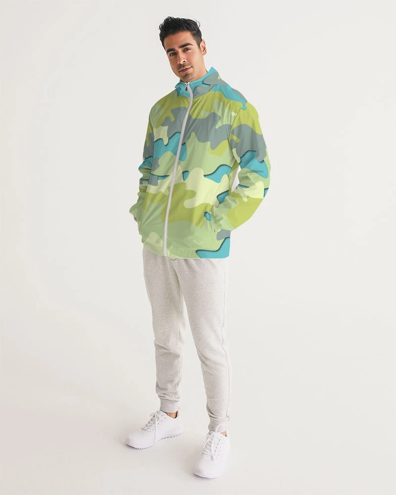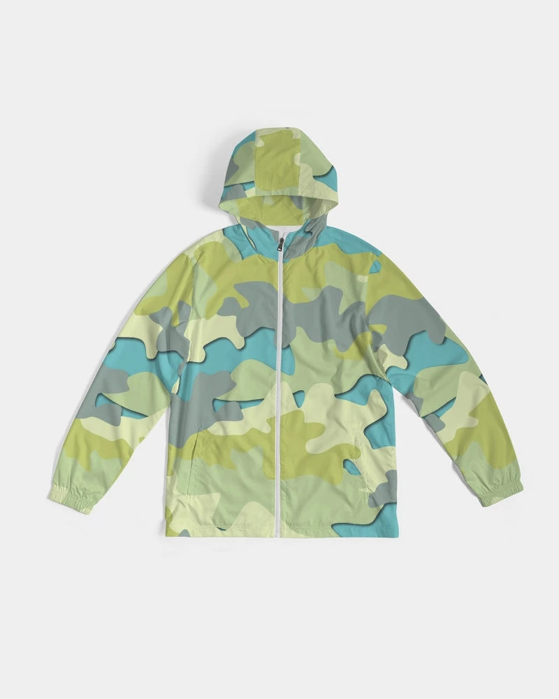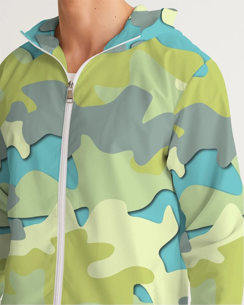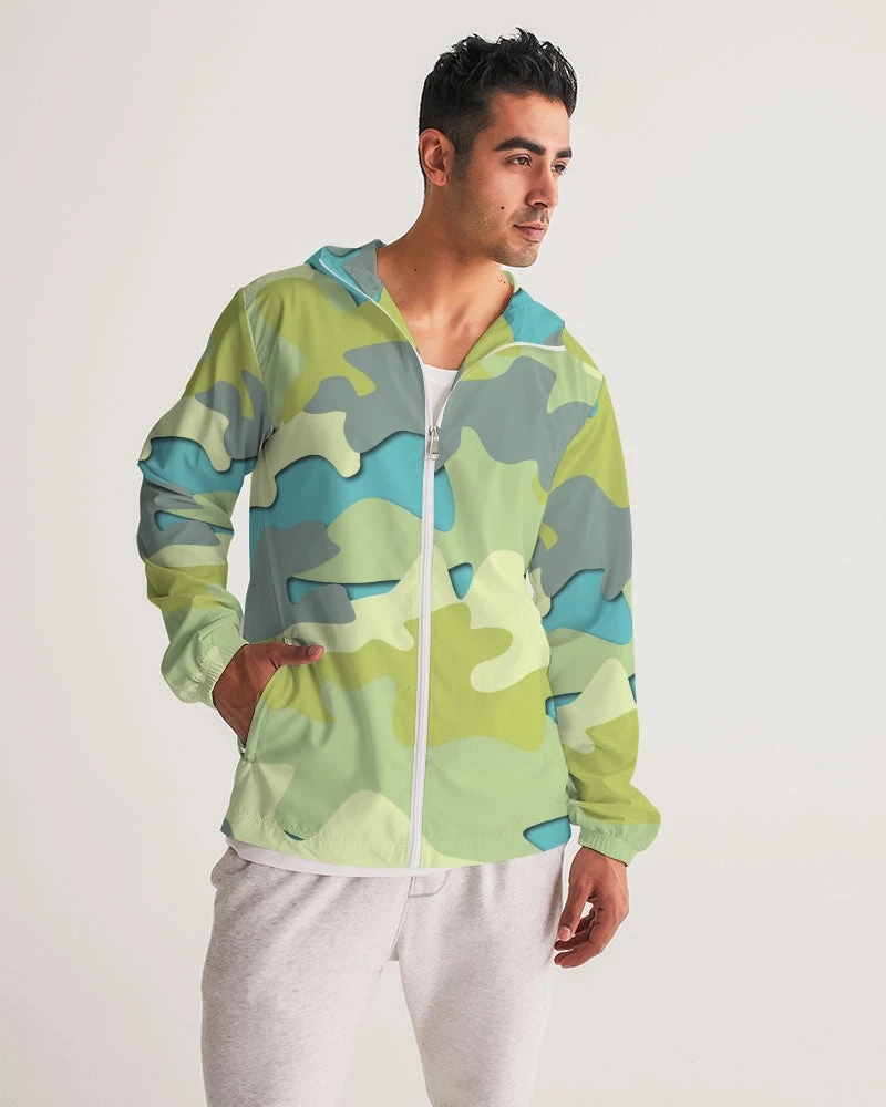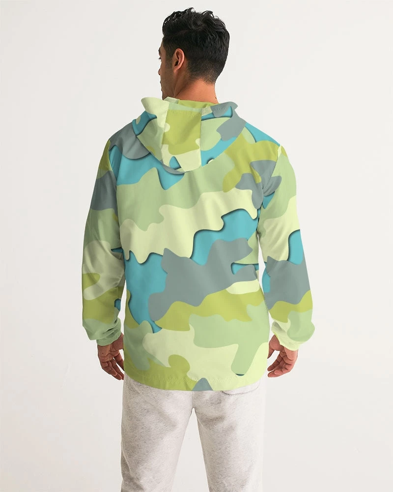 | Our Blue Camo Hooded Windbreaker Jacket is unique and stylish. Perfectly paired with joggers, running shorts or jeans it’s great for providing a bit of warmth and protection from the elements. Handmade with lightweight, water-resistant fabric, and full mesh lining that can layer easily over a T Shirt, Tank or Sweatshirt. A great addition to your wardrobe, this unique camo windbreaker in Blue, Green and Gray color tones will brighten any day.