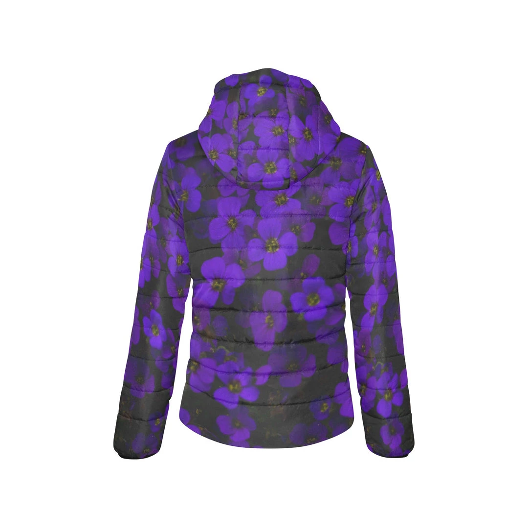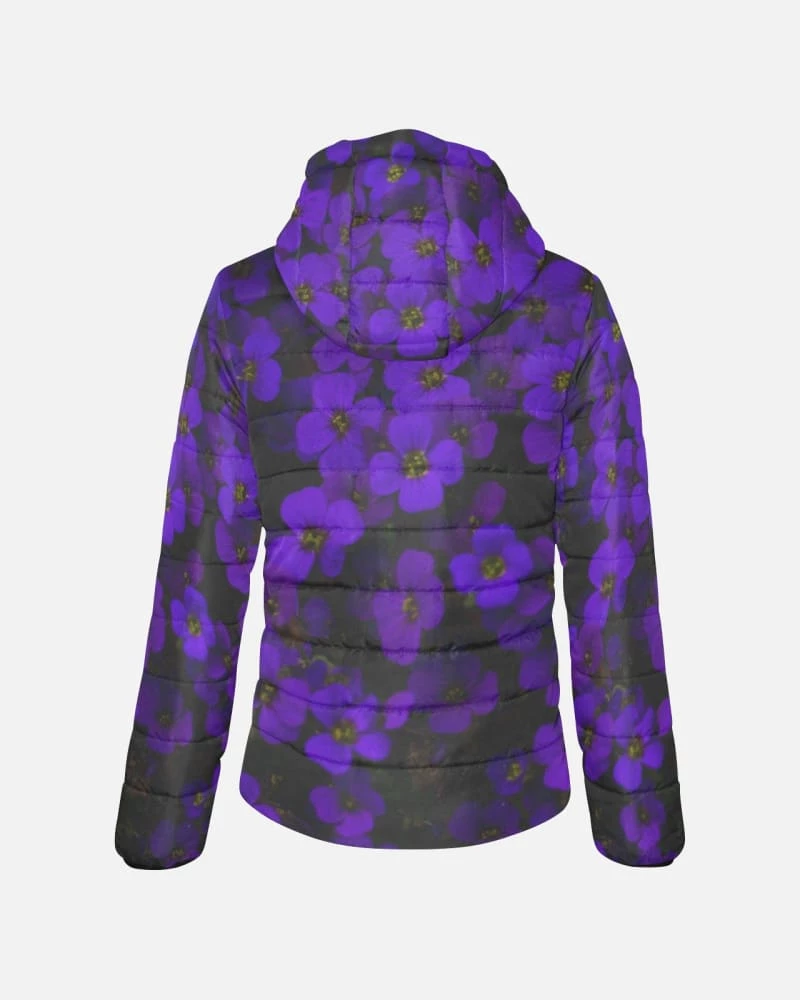 Our Midnight Purple Flower Womens Hooded Puffer Jacket features stunning all over purple flowers. This lightweight jacket is versatile for the cooler seasons with all over padded comfort