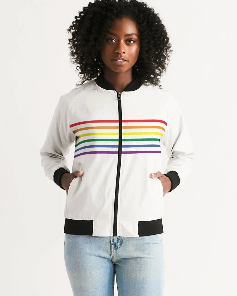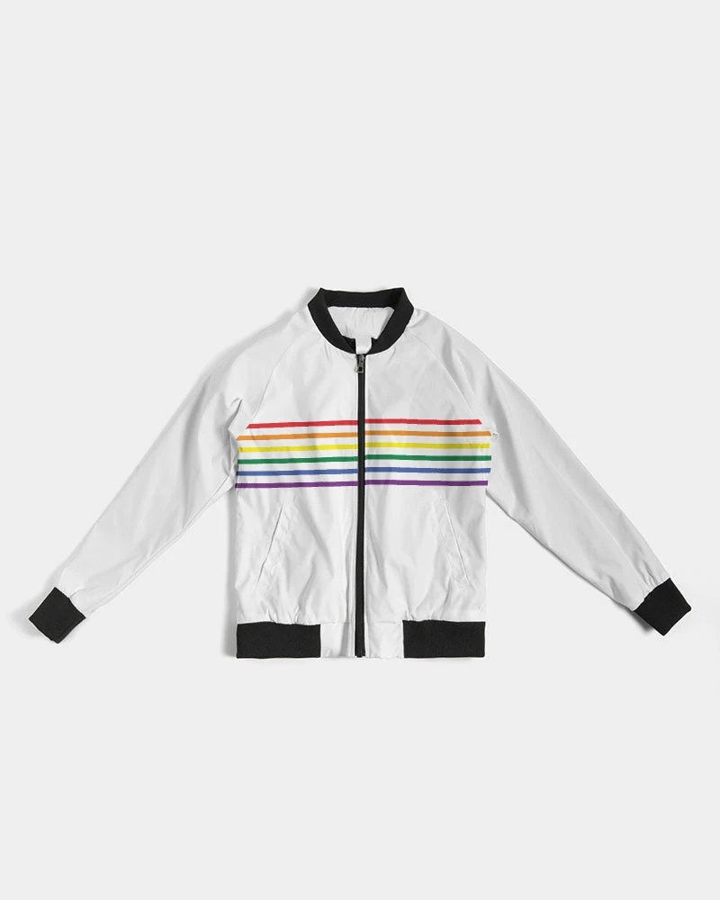 | Hand-cut and crafted with care, our Minimalist Rainbow Stripes Bomber Jacket is great for casual or sportswear. Its lightweight, airy fabric is lined with the perfect amount of insulation for the chillier months making this a great year round go-to.