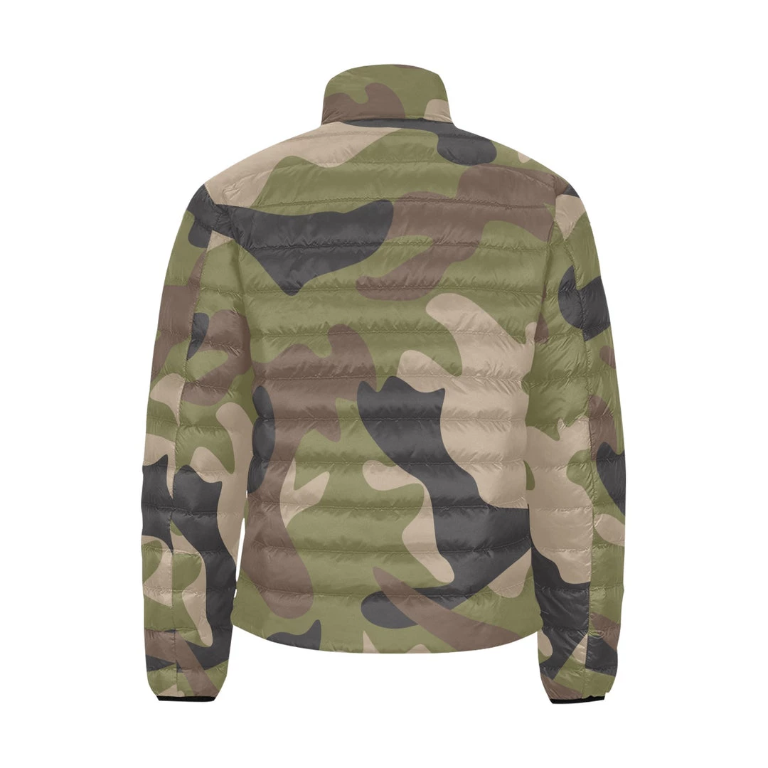 Our Woodland Camo Lightweight Puffer Jacket features an all over classic green camo print This unique jacket features quilted material that is warm and lightweight. It has a high collar, strong zipper, elastic cuffs and two pockets.