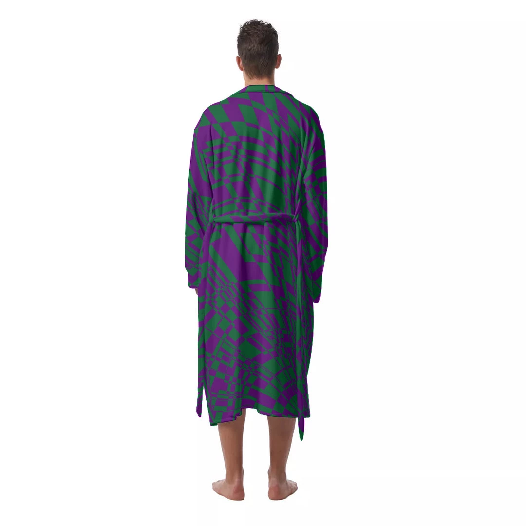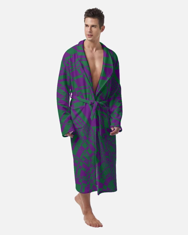 Our Leprechaun Long Robe features an all over abstract pattern in green and purple for a unique look. This longer length robe is fur lined for complete warmth and comfort. Perfect for lounging on cold winter days. It has two side pockets and a tie waist.