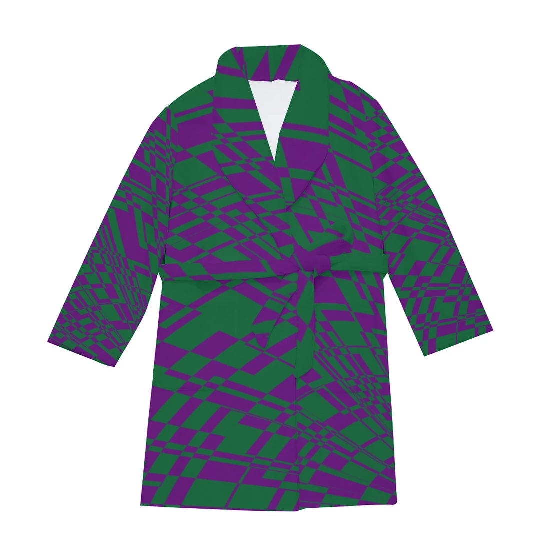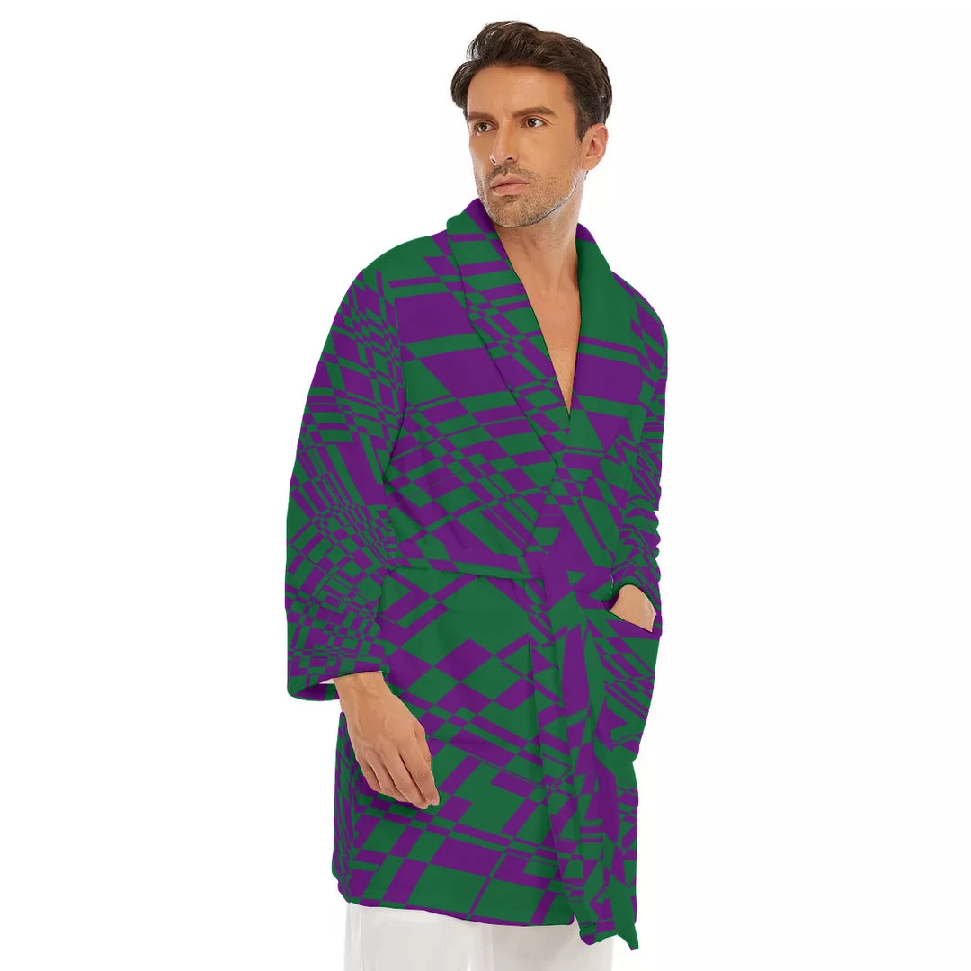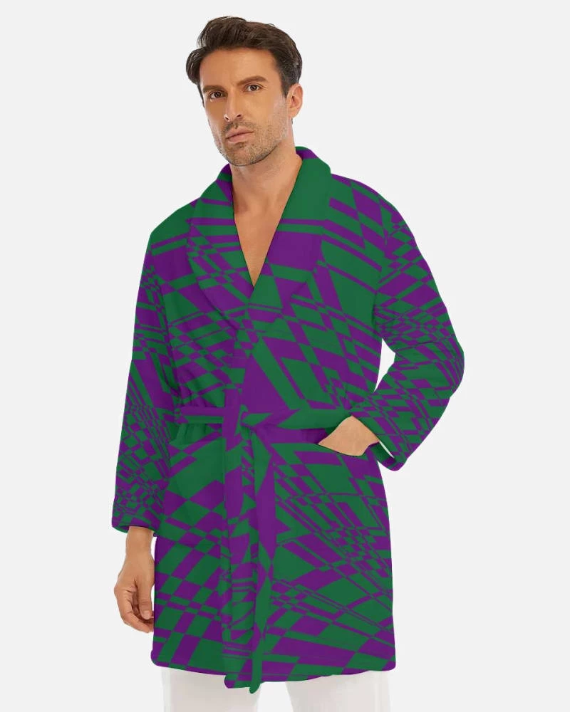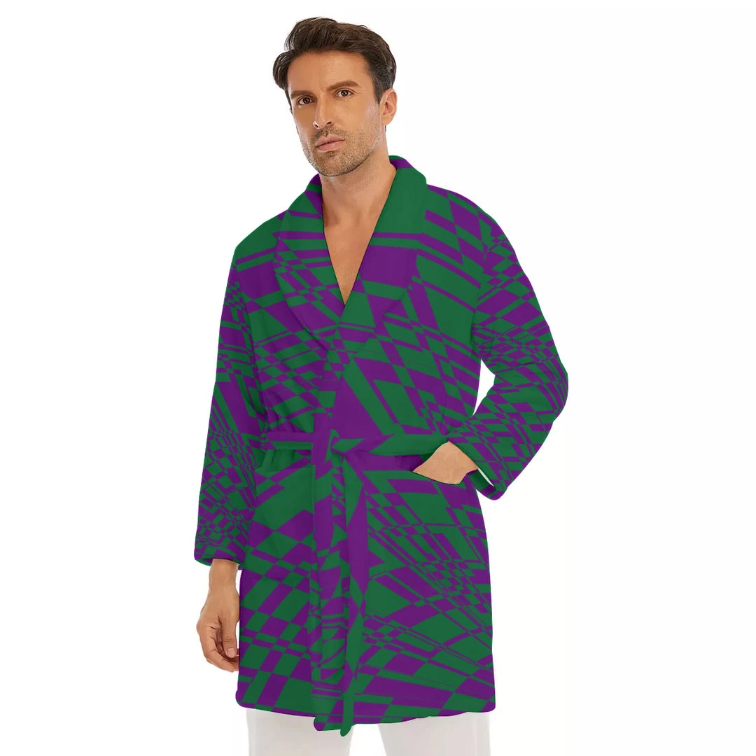 Our Leprechaun Short Robe features an abstract pattern in green and purple This thick shorter length mens robe is made from a soft plush fabric for complete warmth and comfort. Perfect for lounging on cold winter days.
