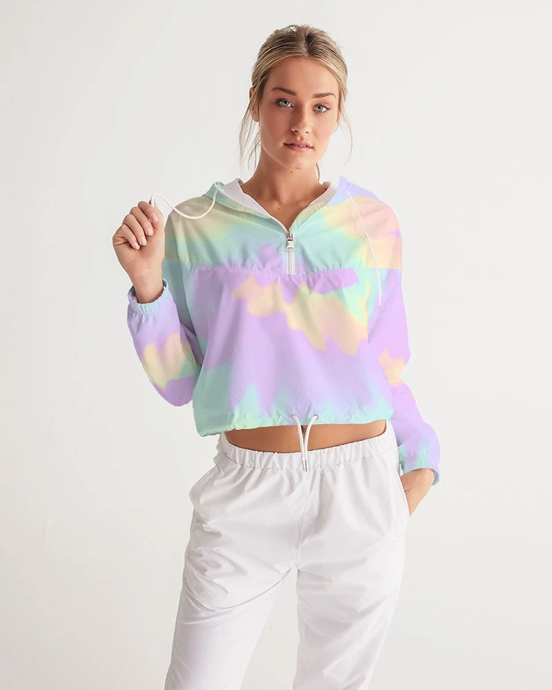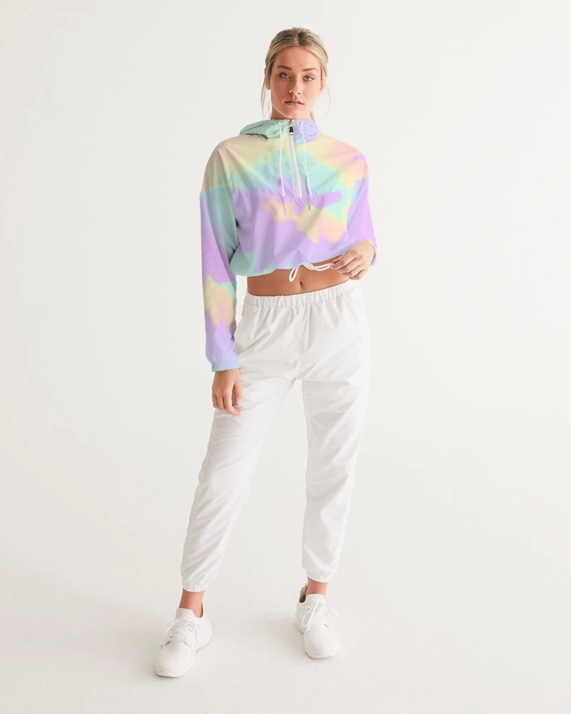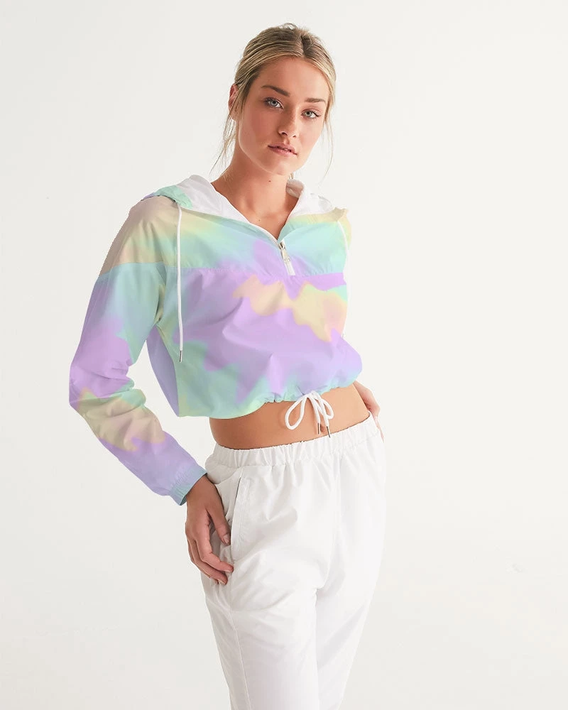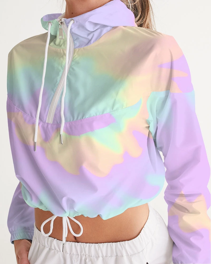 | Our Lilac Mint Tie Dye Cropped Windbreaker features an all over pastel print in purple, green and orange. Made of lightweight, water-resistant fabric, this windbreaker has flexible styling options. Perfect with activewear, joggers, pants and jeans it is versatile enough to be worn on a run, at the mall or a night on the town. Premium quality design with full lining. The bright pastel print makes and cold and dull day warm.