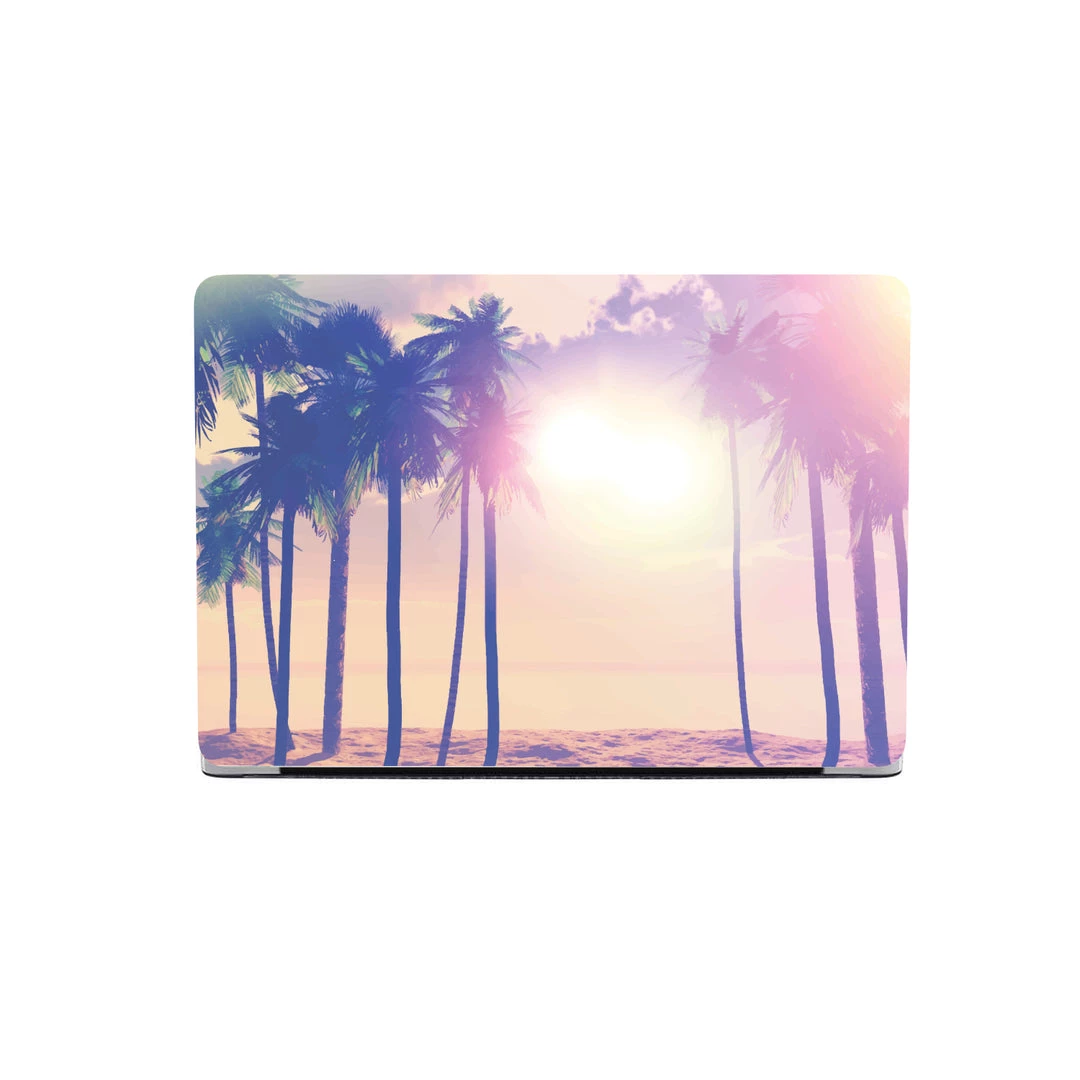 Our Summer Sunset Macbook Case features a stunning sunset in an island paradise with palm trees on the beach.