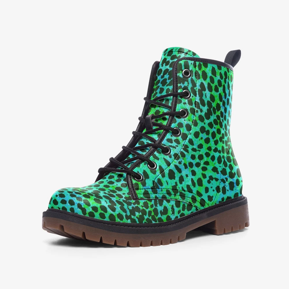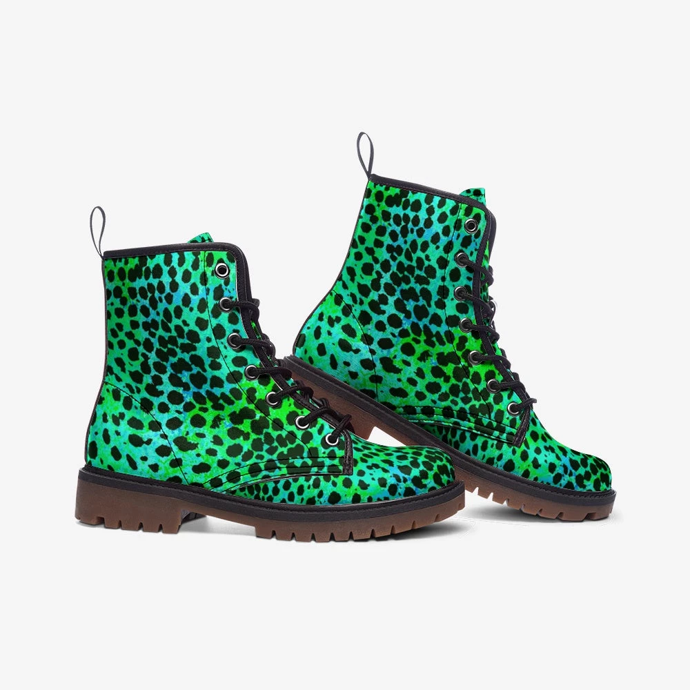 Our Neon Green Leopard Print Lace Up Boots feature a classic leopard print over a bright neon green. Bold boots for unique individuals.