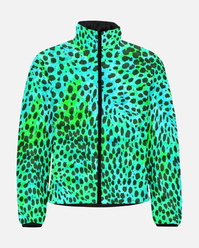 Our Neon Green Leopard Print Puffer Jacket features an all over leopard print in neon green. This designer jacket features quilted material that is warm and lightweight. It has a strong zipper, high collar, elastic cuffs and two pockets.