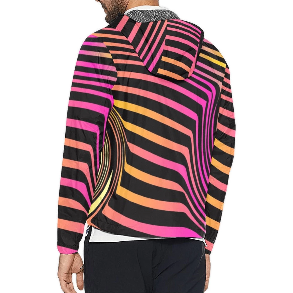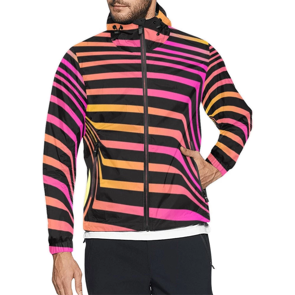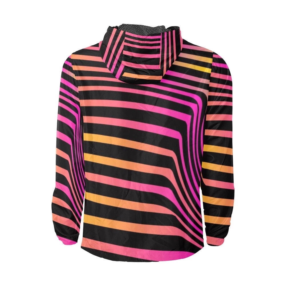 Our Neon Sunrise Striped Hooded Windbreaker Jacket has a unisex fit. It features a contemporary all over striped pattern in neon orange, yellow and pink tones over black. Perfect for protecting yourself from the elements it can be worn in active situations, or just grabbing a coffee – the choice is yours.