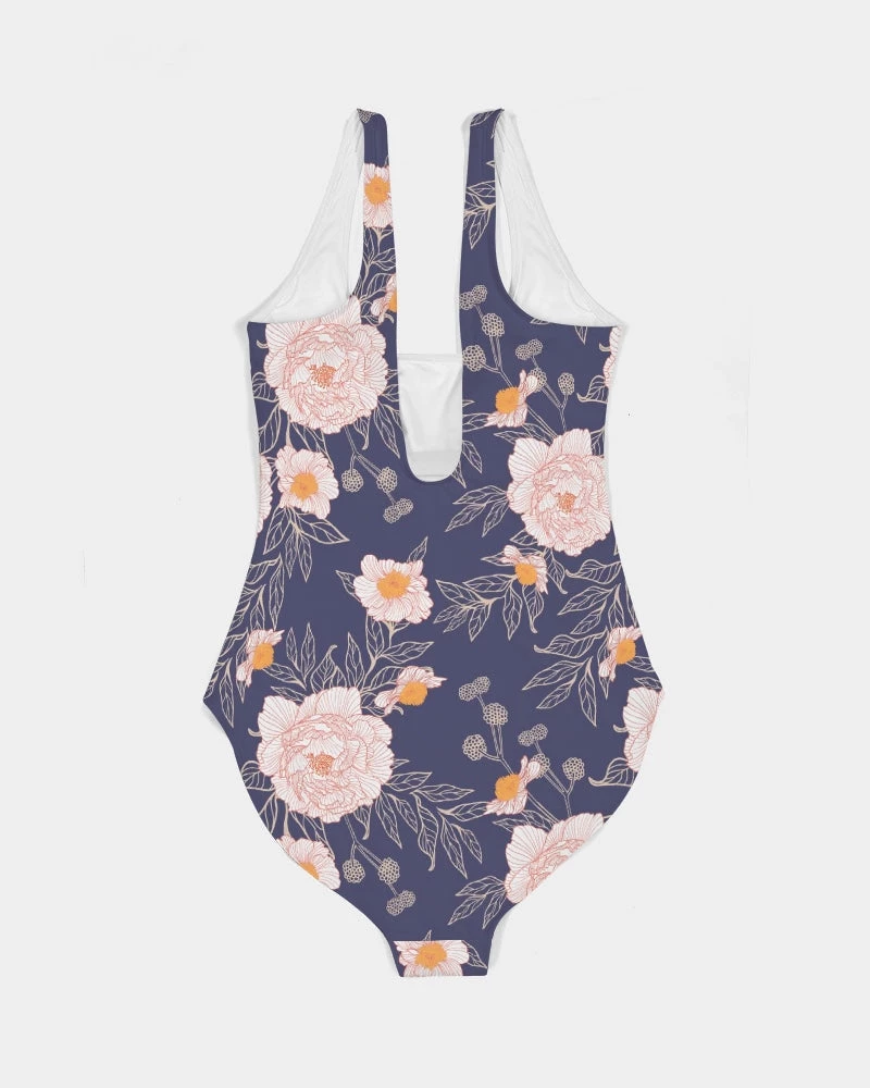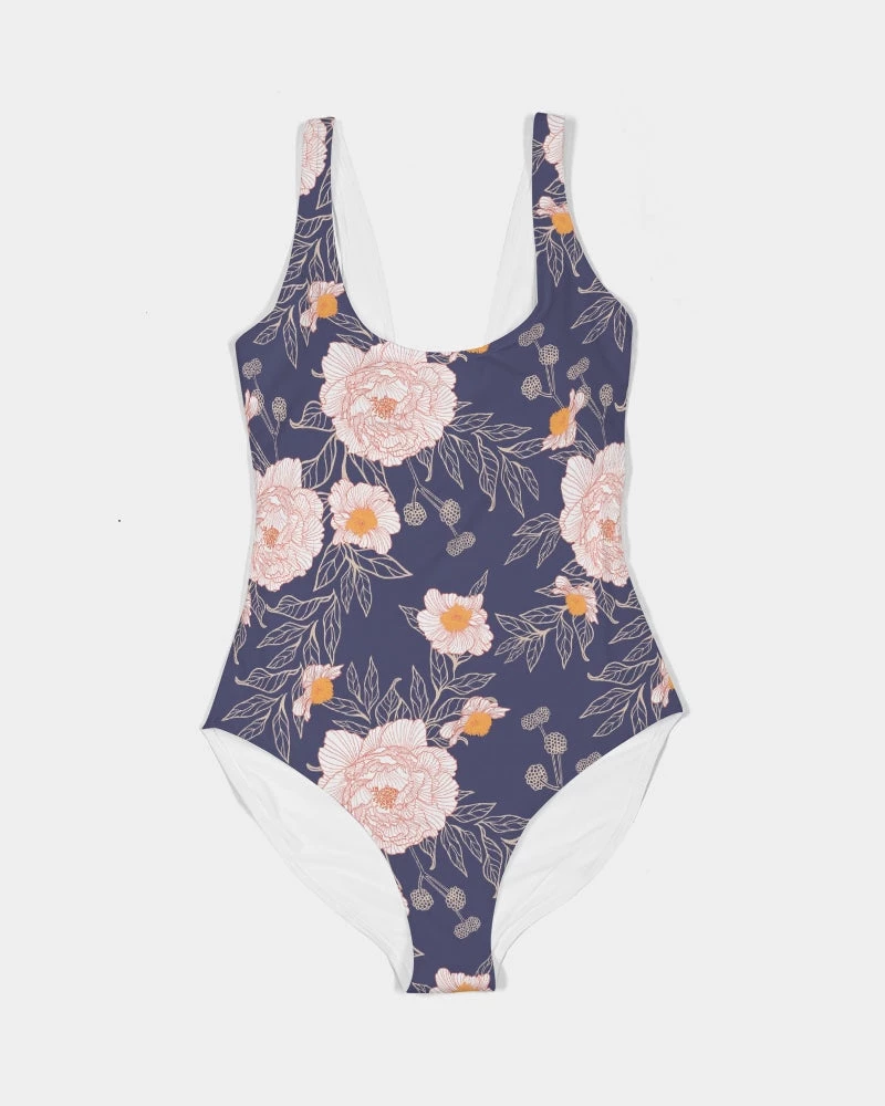 | Our Orange Peonies Floral Orient Blue One Piece Swimsuit features a gorgeous orange floral print over blue. With its simple scoop neck and modest cuts, it compliments all body types. Stretchy, padded, and built-in UPF 50+, this swimsuit offers excellent comfort, support, and UV protection.