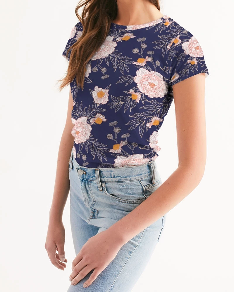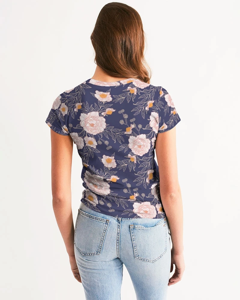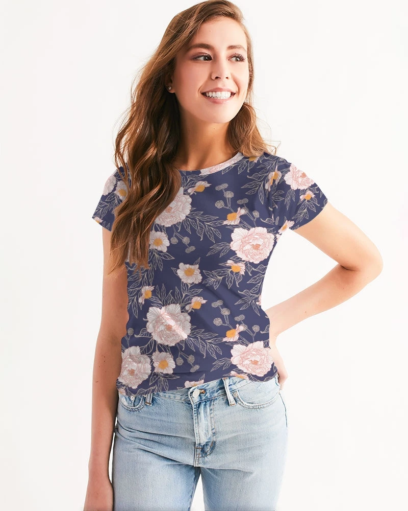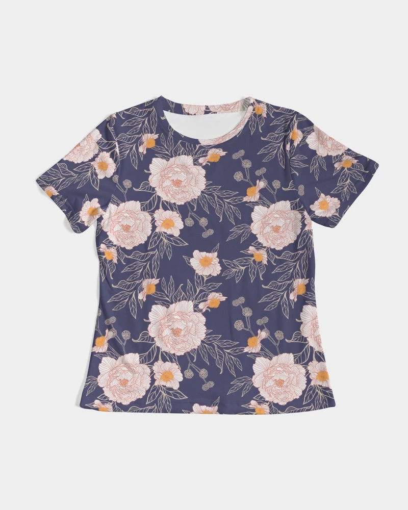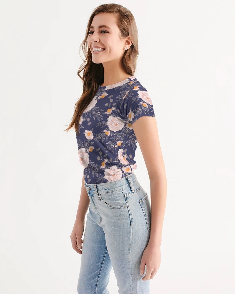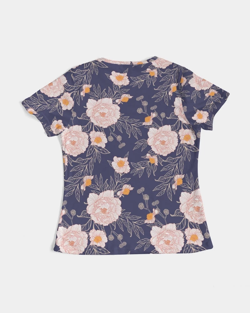 | Dressed up or down, our Orange Peonies Floral fitted Women’s Tee in Orient Blue offers complete comfort and style. Handmade with premium wear resistant fabric with an all over floral print.