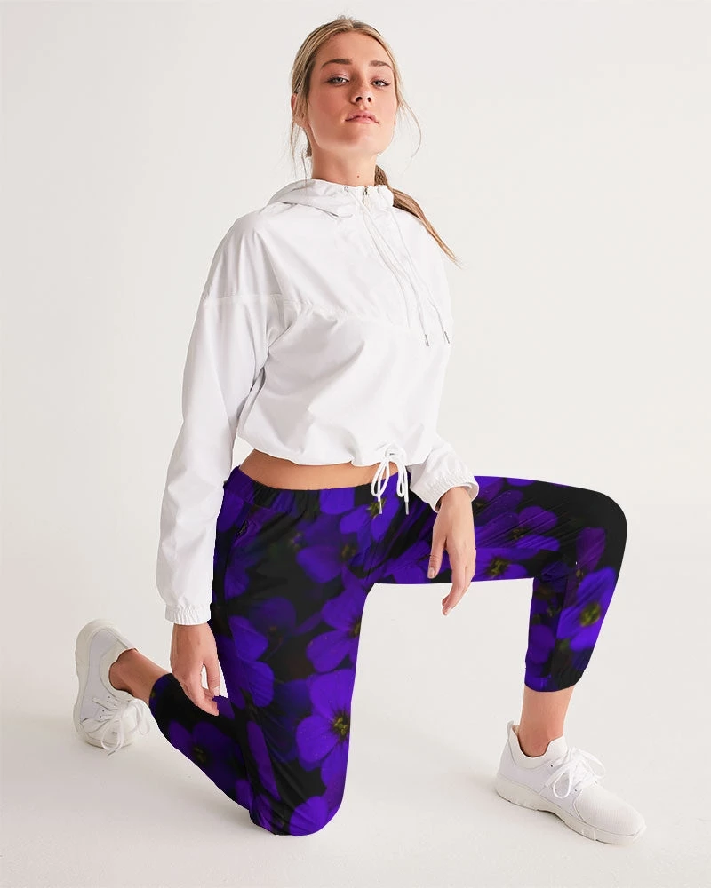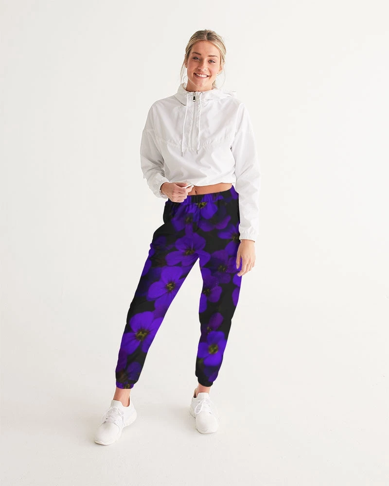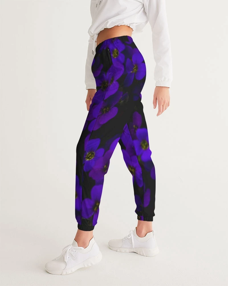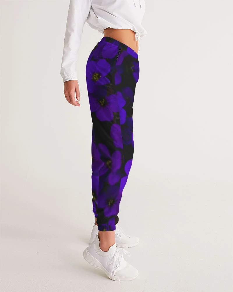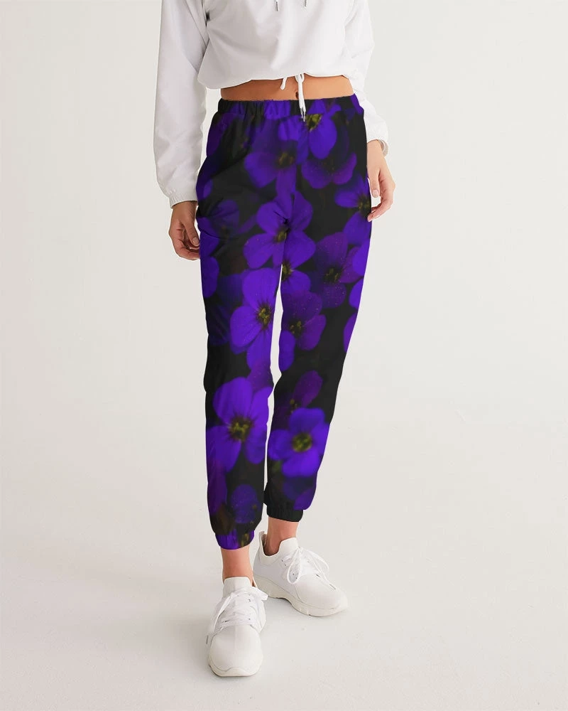 | Our Midnight Purple Floral Womens track Pants are both lightweight and versatile. Their water-resistant fabric keeps you dry and comfortable. The relaxed fit makes it great street-worthy style. Premium quality with full mesh lining. Designer floral pants in black with purple flowers.