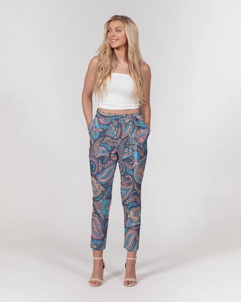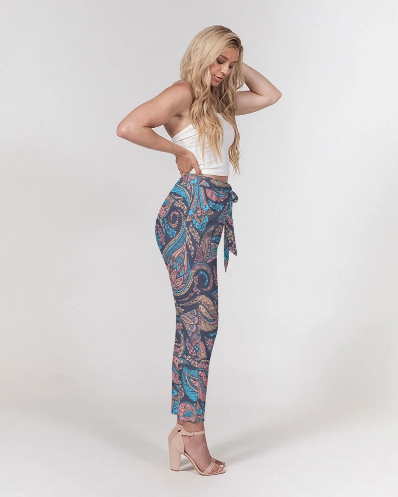 | Our Perfect Paisley Women’s Belted Tapered Pants are designed to sculpt your figure in all the right places. Comfortable and stylish. Made from smooth chiffon with moderate stretch and finished with a high-rise waist and tapered cut. A beautiful paisley design in a range of pinks and blue.