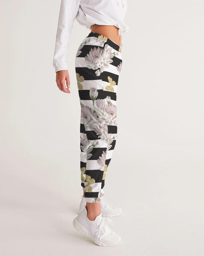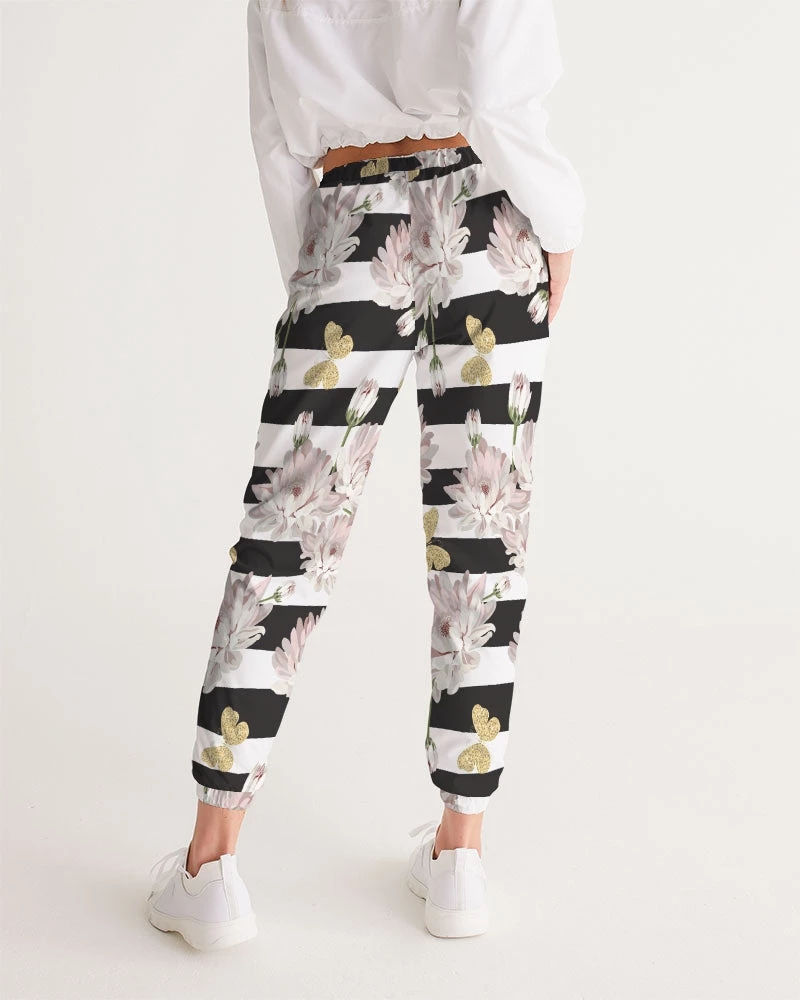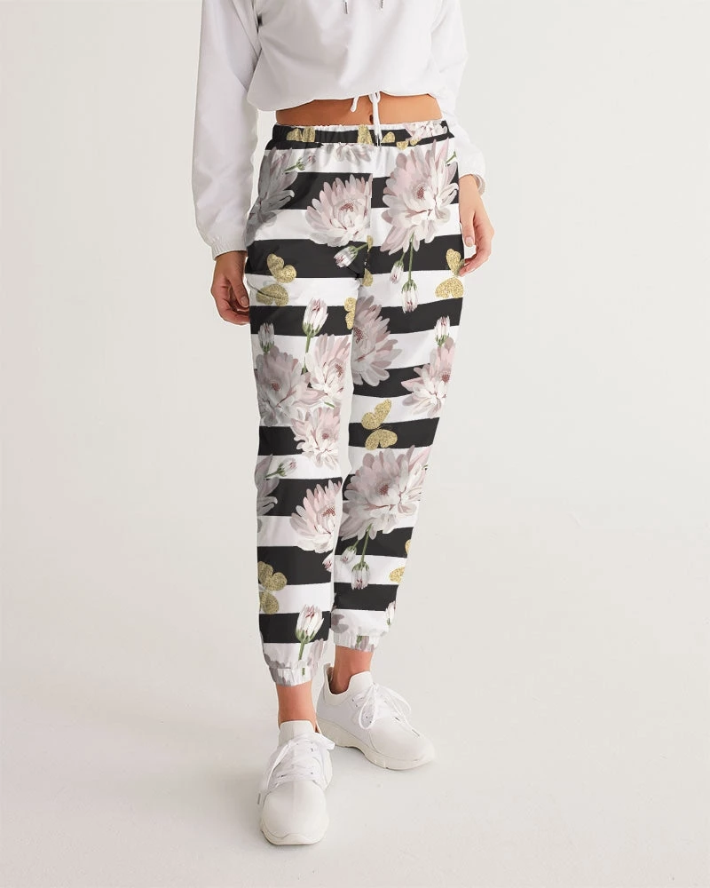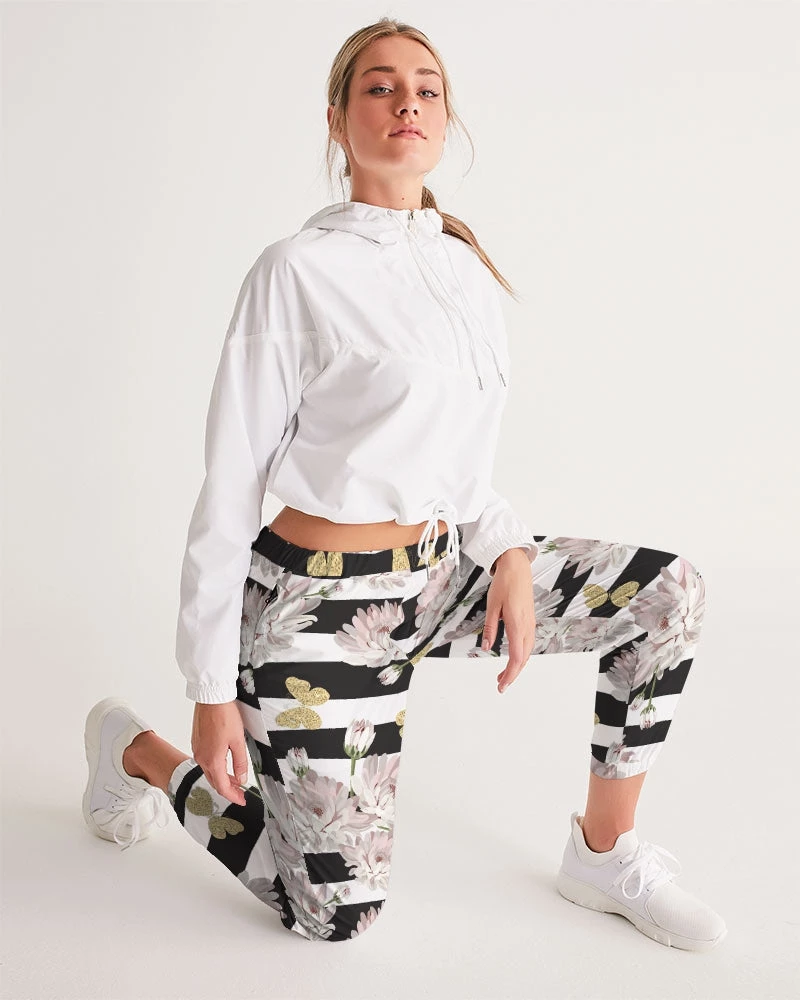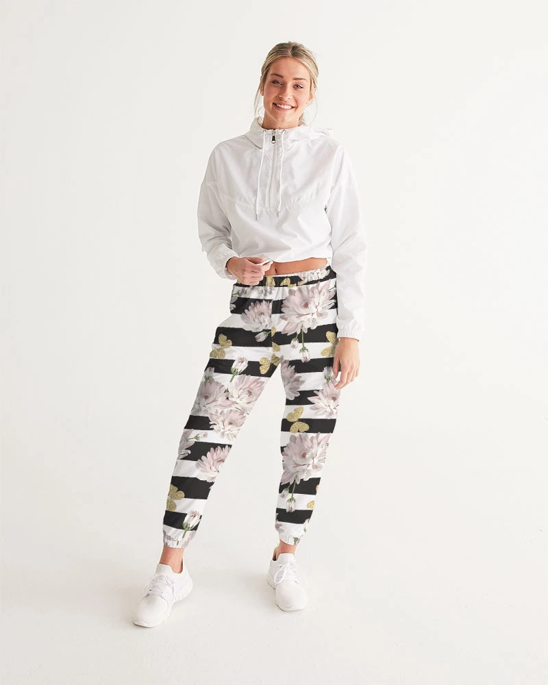 | Our Pink Chrysanthemum Butterflies Track Pants are both lightweight and versatile. The water-resistant fabric keeps you dry and comfortable in active situations. The relaxed fit makes them street-worthy style. Premium quality they are fully lined with mesh lining. The design features pink chrysanthemum flowers, with glittering butterflies over a black and white stripe background.