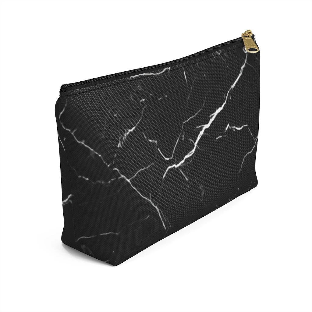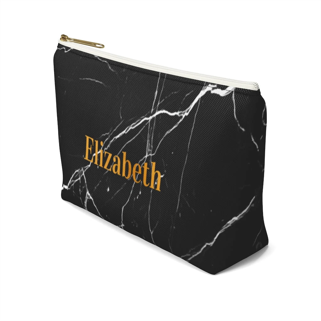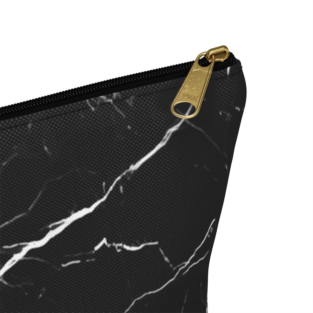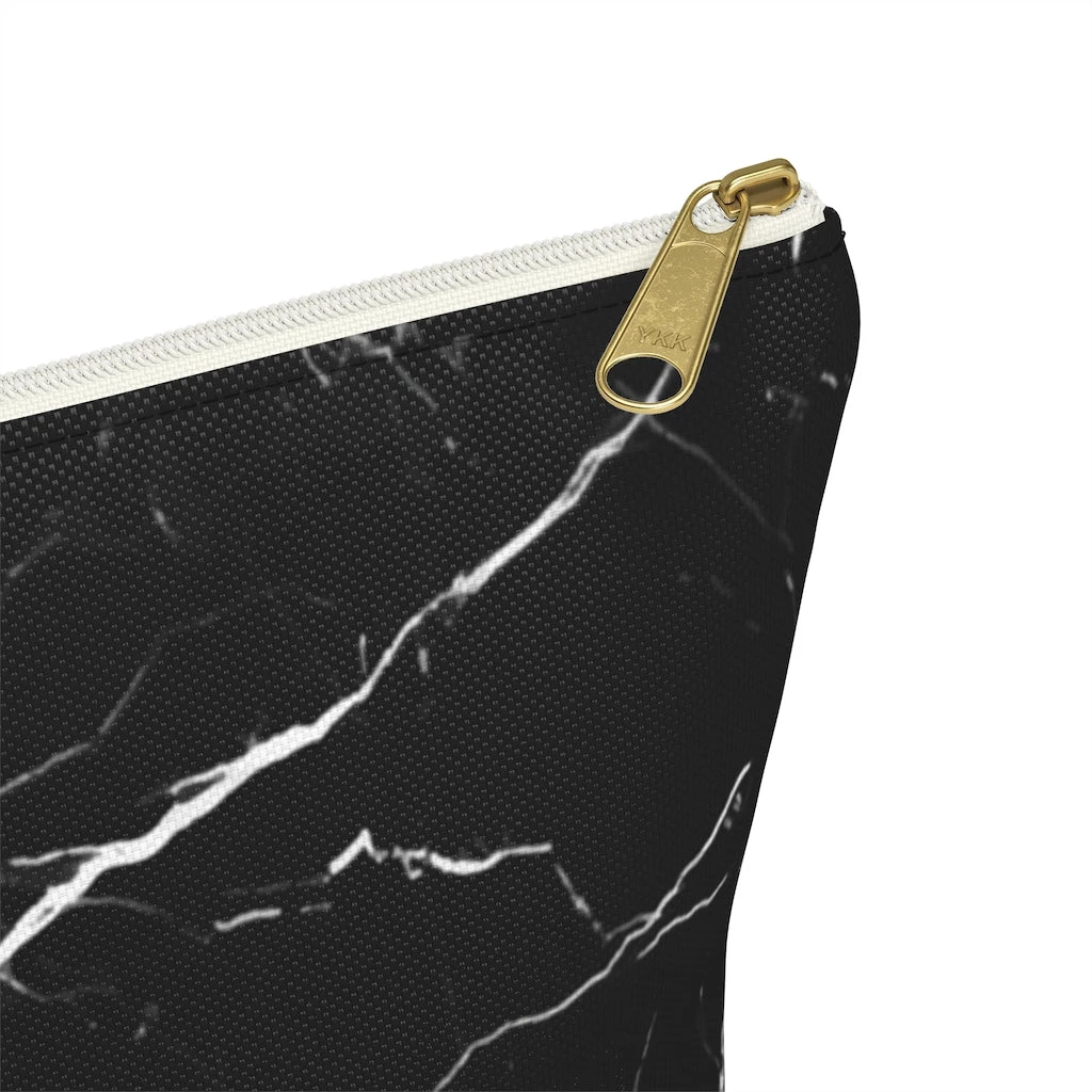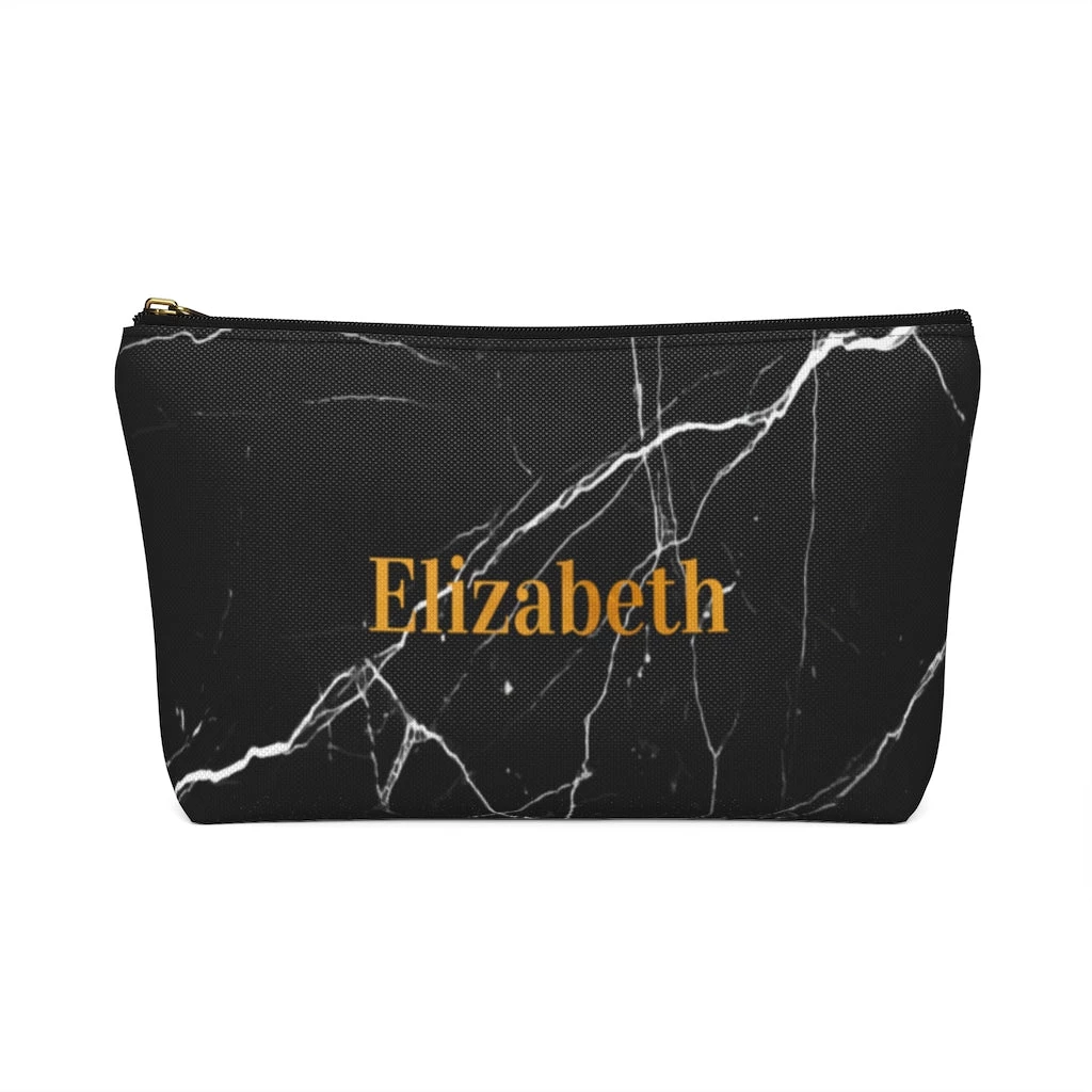 Personalize this chic Black Marble Cosmetics Bag with or without your name and initials. This versatile accessory pouch can be used for a variety of uses. Fill it with cosmetics, travel accessories or your phone and stationary. It’s classic look makes it unisex in design with gold foil look printed lettering.