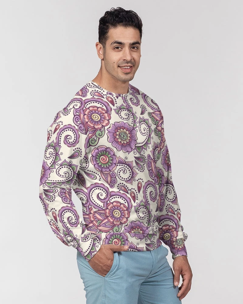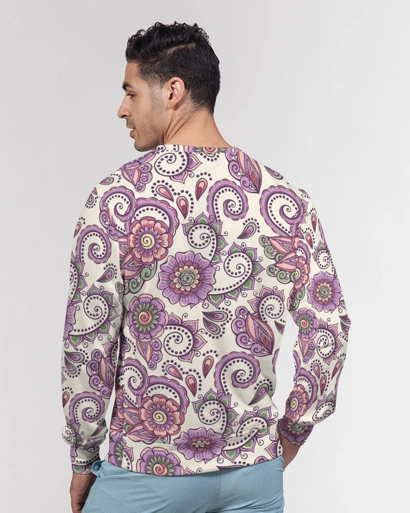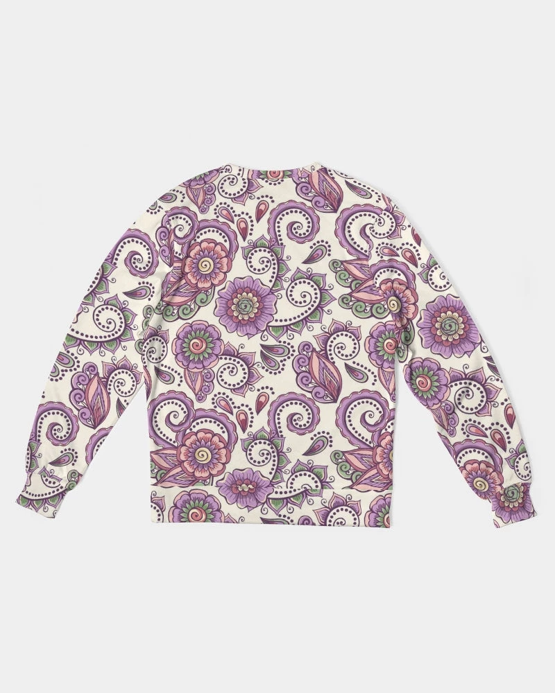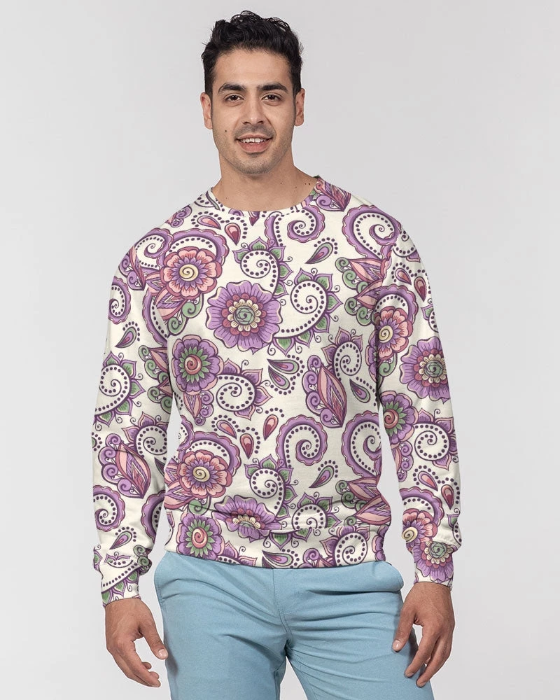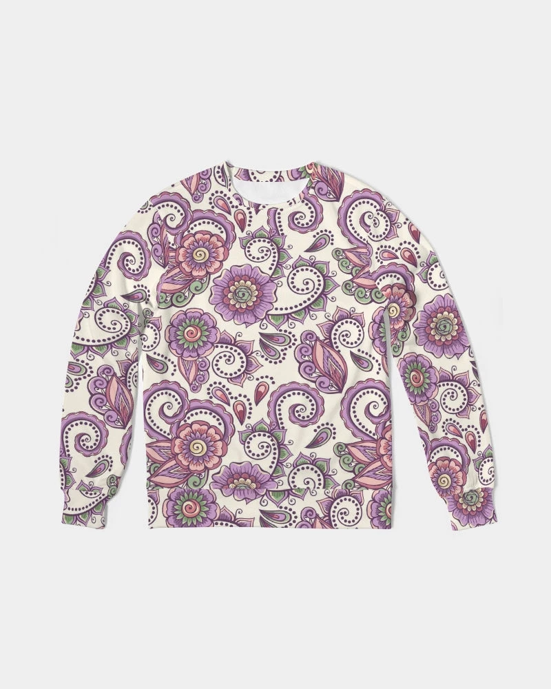 | Our Purple Cream Paisley Classic French Terry Crewneck Pullover has a bold all over paisley print. The regular fit is not too big, but not too tight so you can layer it or wear it alone. Finished with a smooth surface on the outside and loop knitting inside for the right amount of warmth and comfort.