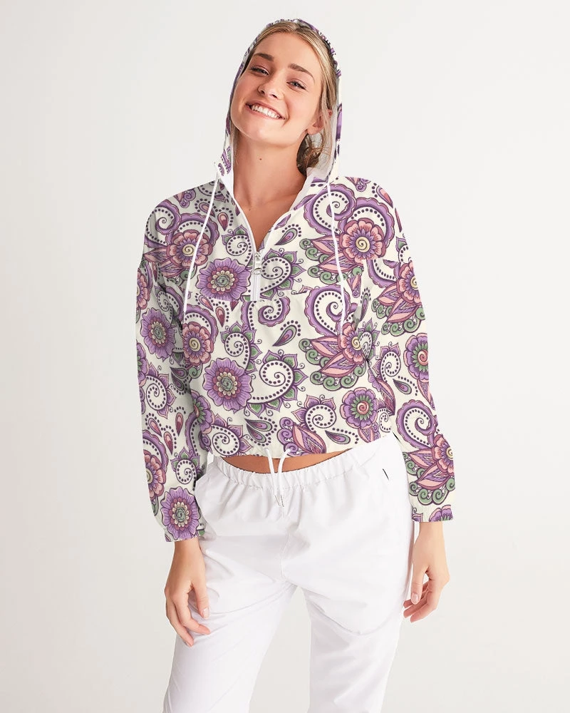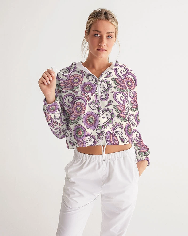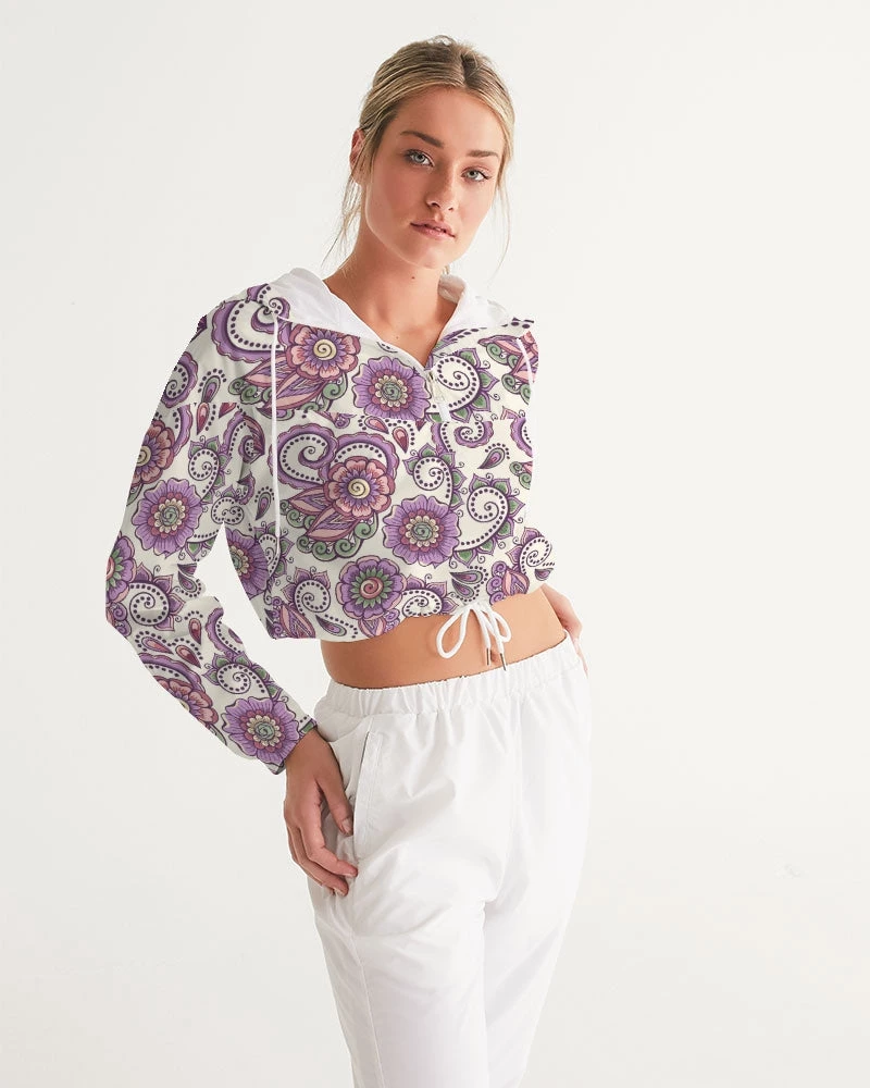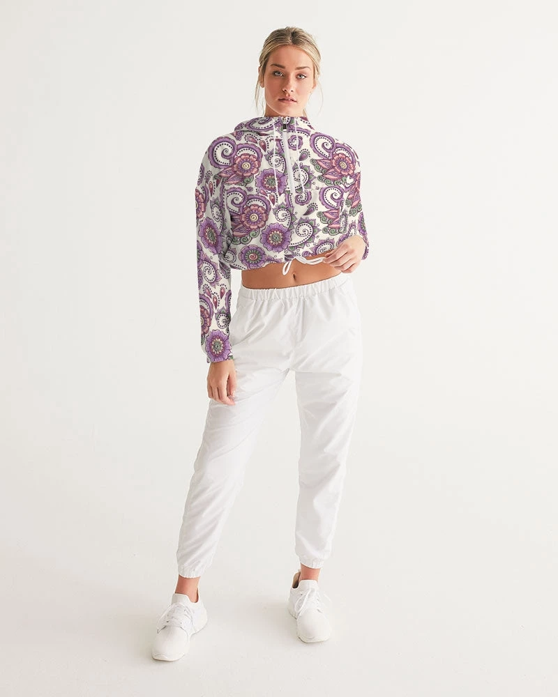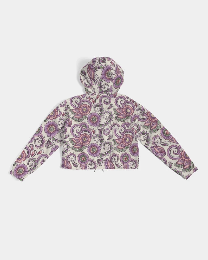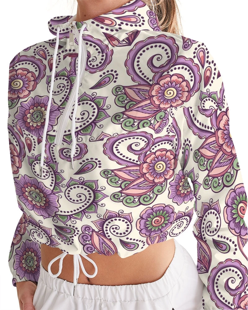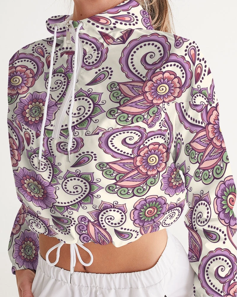 | Our Purple Cream Paisley Cropped Windbreaker features an all over contemporary paisley print. Made of lightweight, water-resistant fabric, this windbreaker has flexible styling options. Perfect with activewear, joggers, pants and jeans it is versatile enough to be worn out running, at the mall or a night on the town. Premium quality design with full lining.