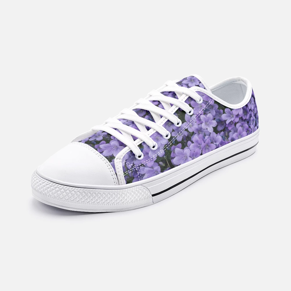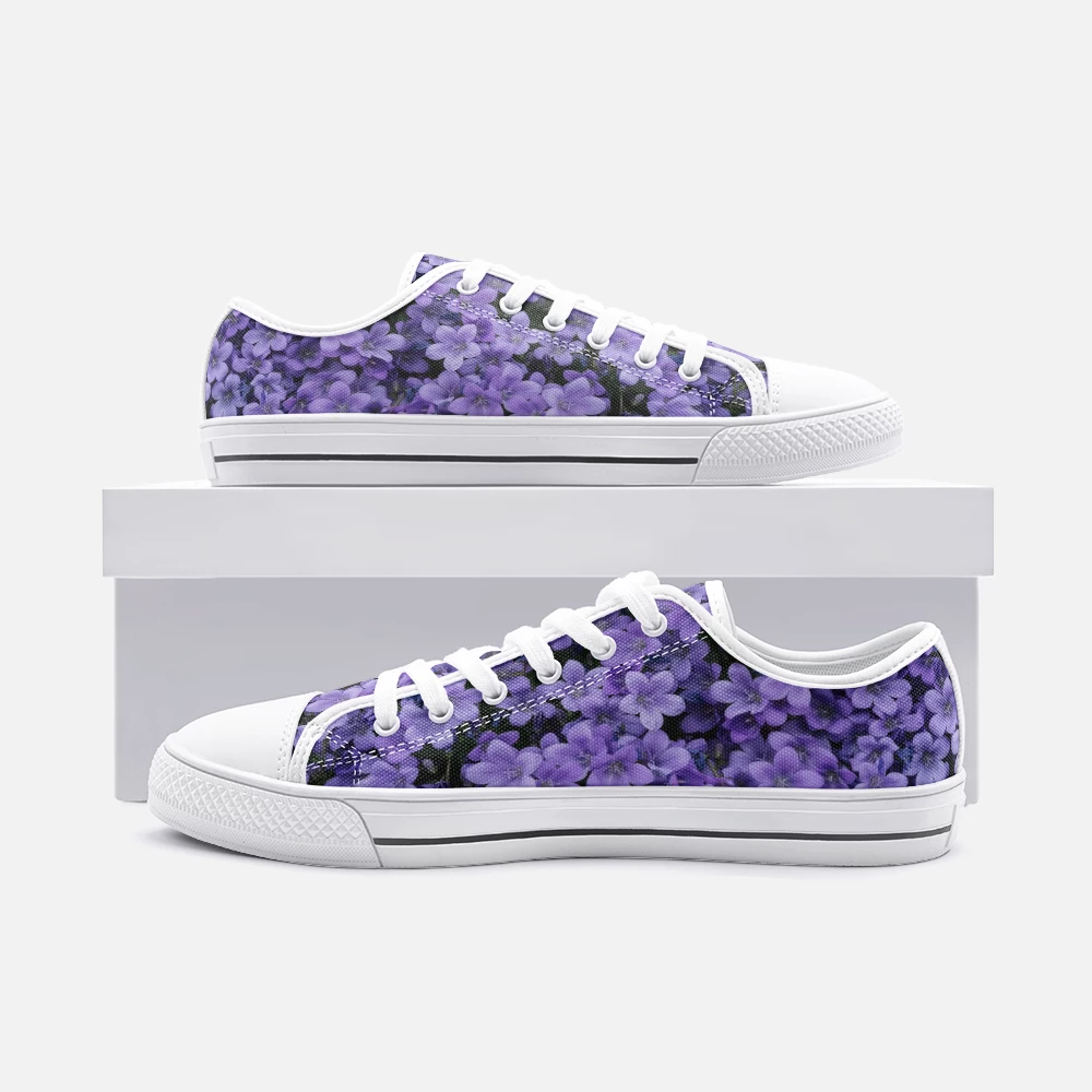 Enhance your shoe collection with our Purple Flower FLow Top Canvas shoes. With a rounded toe construction they feature soft textile lining, and lightweight construction for maximum comfort. The lace up closure ensures a snug fit with metal eyelet for a classic look. The high quality outsole provides traction and exceptional durability.