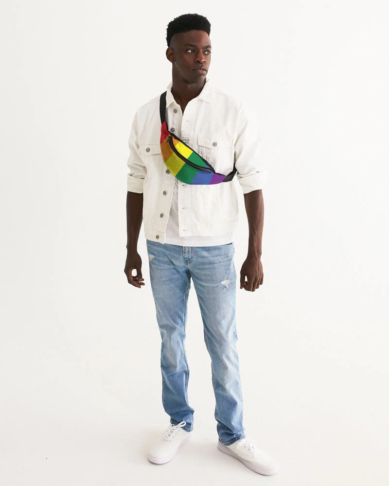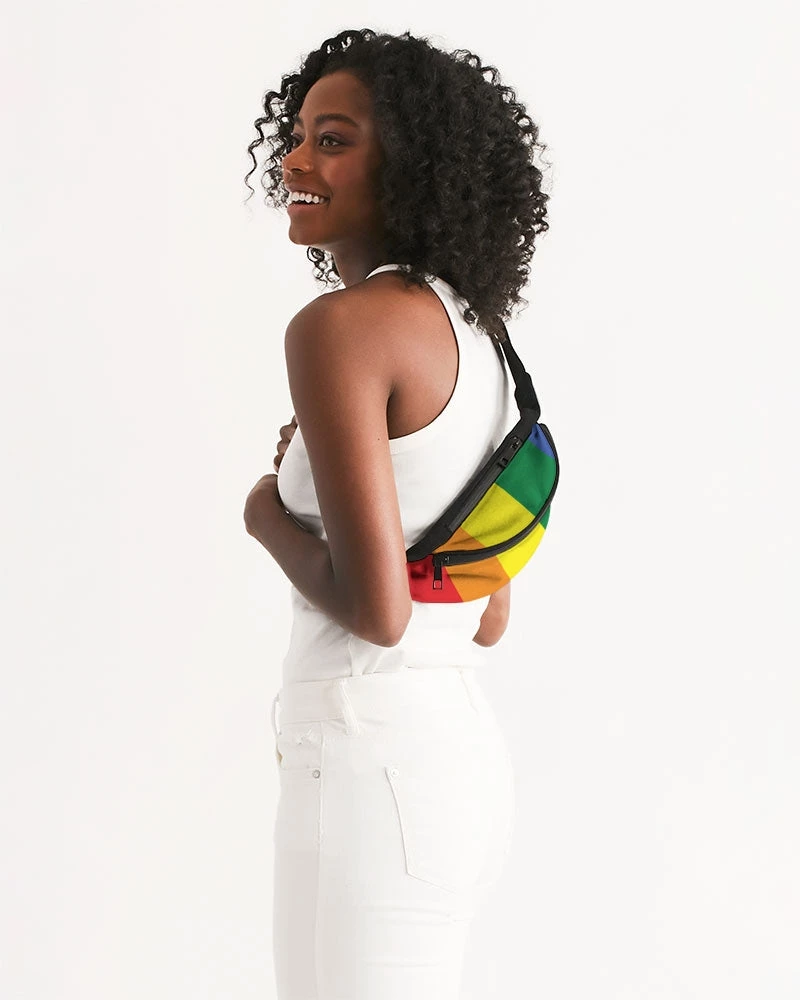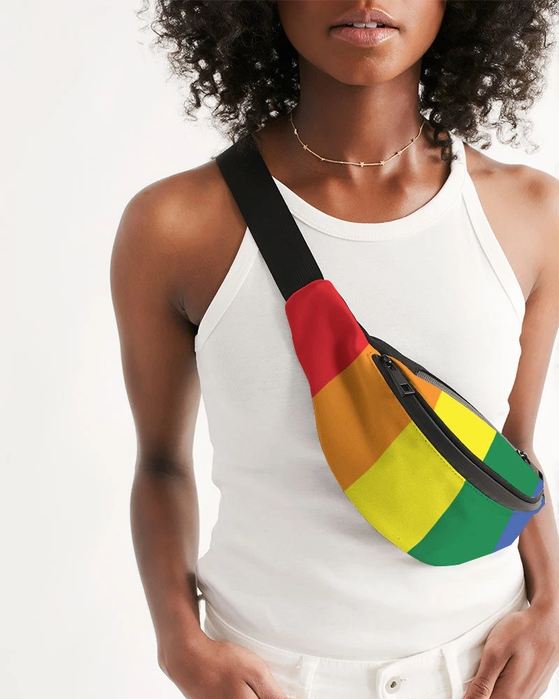 | Designed to keep your essentials in order, our Rainbow Pride Crossbody Sling Bag can be worn over the shoulder or around the waist for easy access. With two zip compartments, an adjustable belt and a buckle closure, this bag is perfect for carrying your phone, sunglasses, money, and travel essentials. Simple yet stylish. This everyday accessory features all over rainbow stripes.