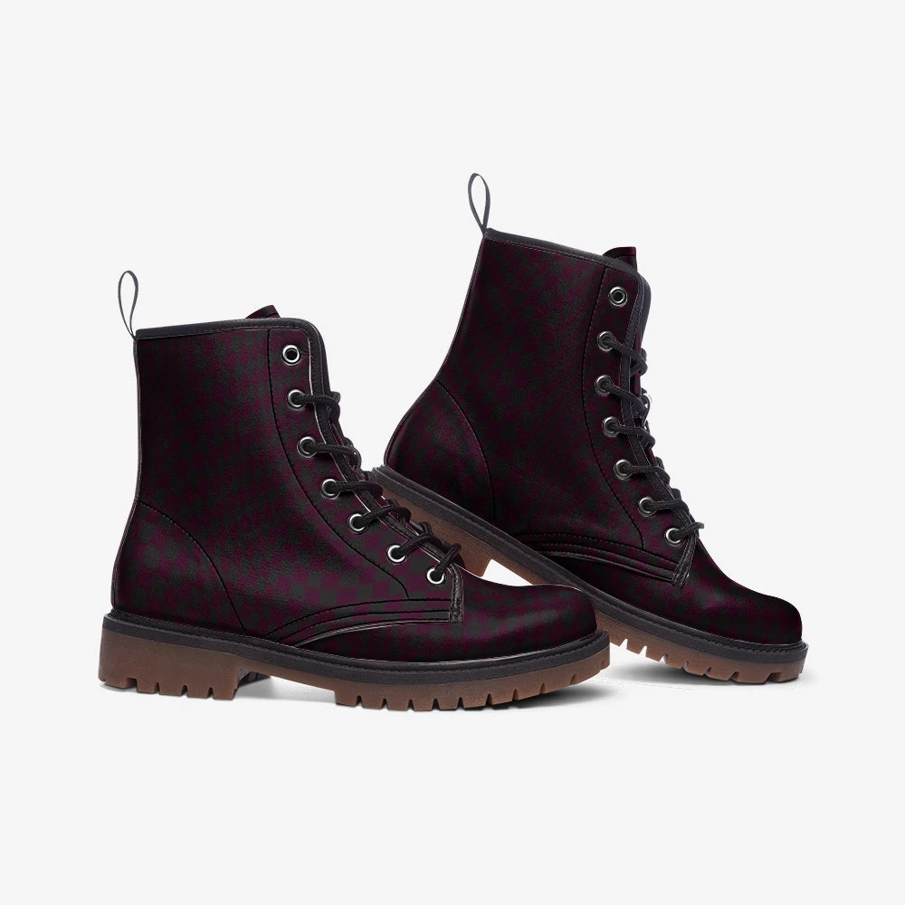 Our Red Wine Abstract Checkerboard Lace Up Boots feature an all over abstract checkerboard print in deep red and black.