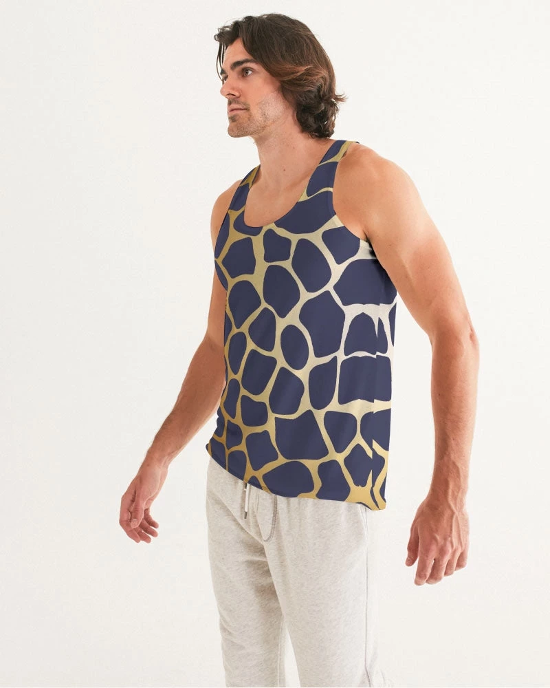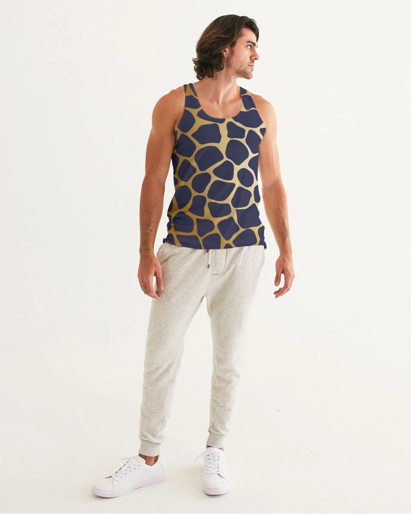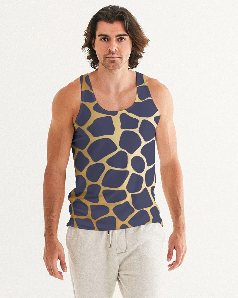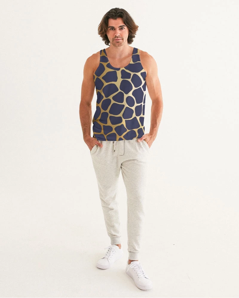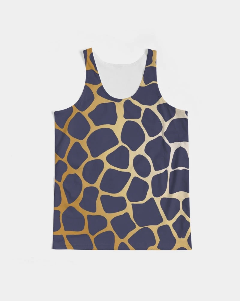 | Our Regal Giraffe Men’s Tank features an all over contemporary giraffe print. This bold giraffe print in navy over a gold gradient will expose your inner wild. A designer tank to add to your collection. It has a slim fit and breathable fabric guaranteeing style and comfort.