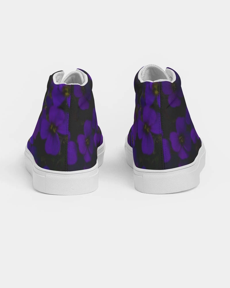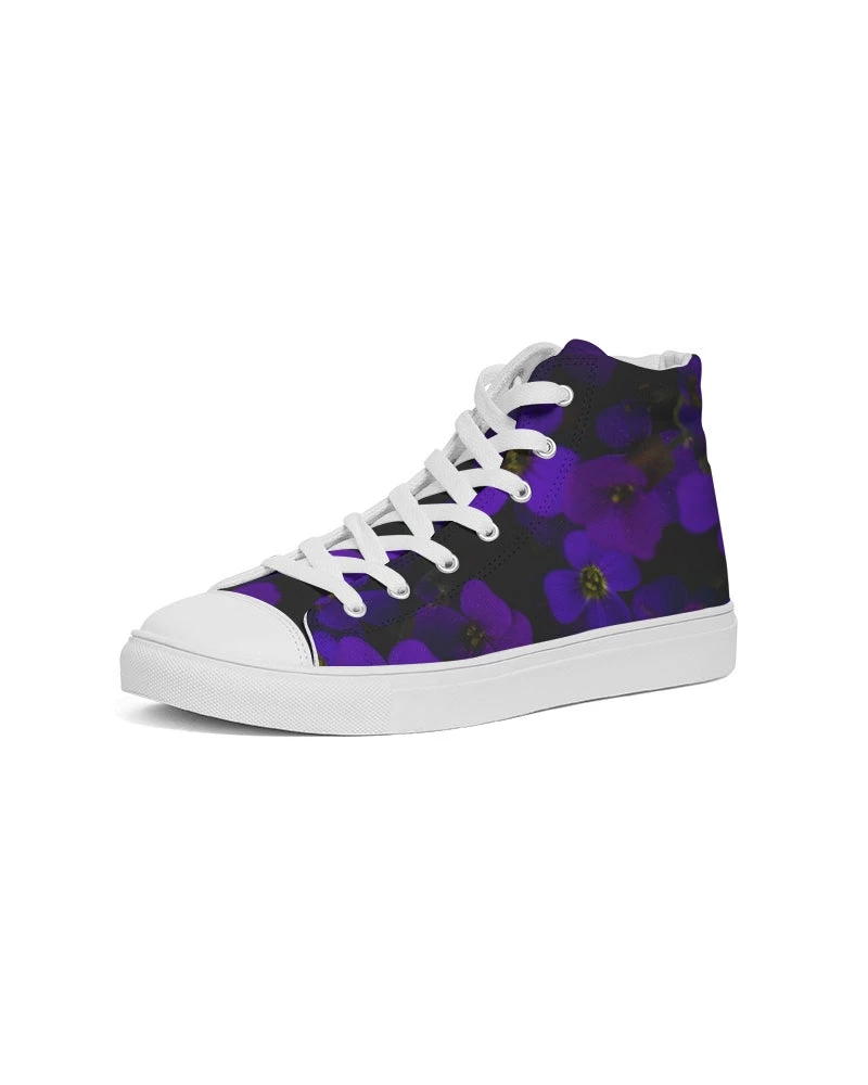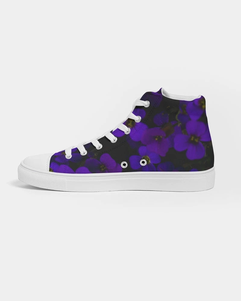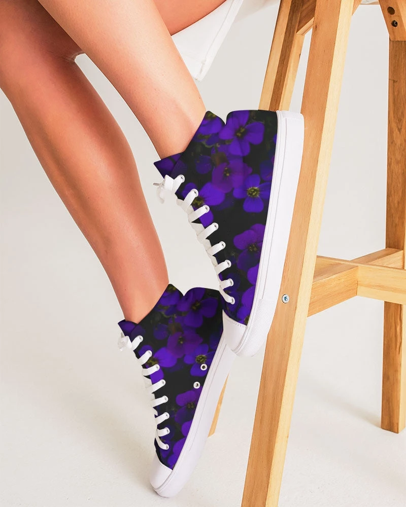 | Our Midnight Purple Floral Hightop Canvas Shoes feature an all over dark purple flower print . Bound to be your daily go-to with all day comfort. Stunning enough to be worn at the mall or dinner with the girls.