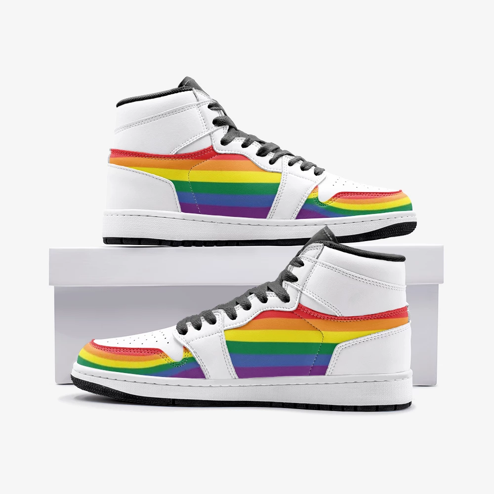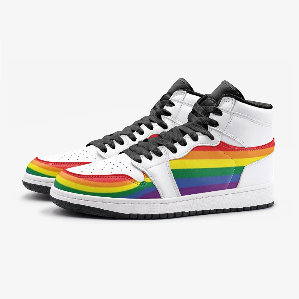 Color your outfit with these rainbow striped pride sneakers. Emblazoned with the colors of the pride flag you’ll be turning heads whilst you perform in the street parade or party long into the night.