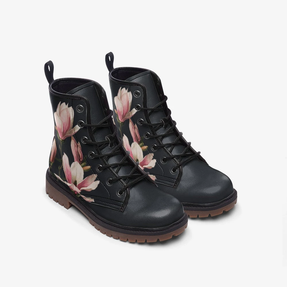 Our Vintage Magnolias Lace Up Boots feature stunning magnolia flowers.