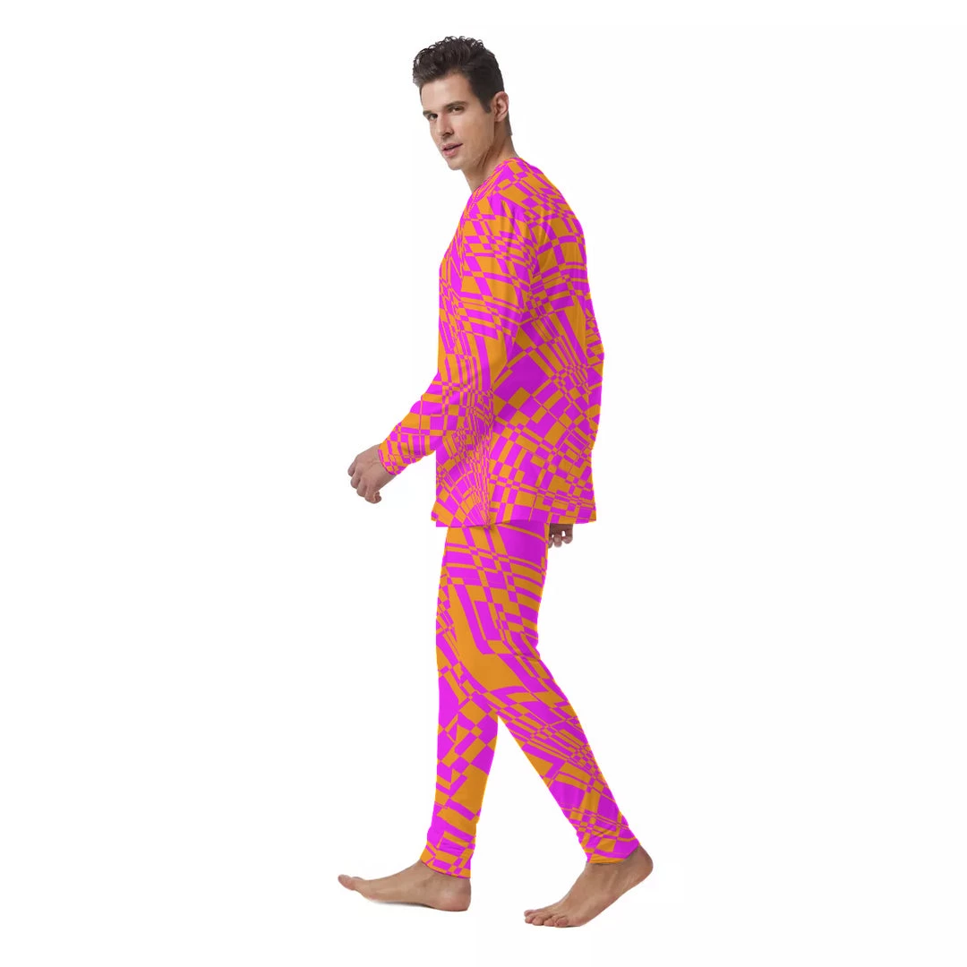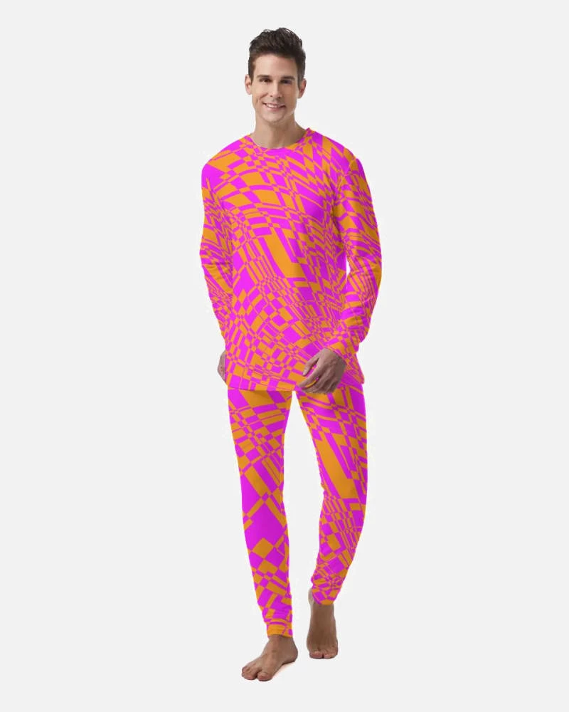 Our Fuchsia & Orange Warp Men’s PJ set features on-trend colors in a super cool abstract pattern. The super soft fabric provides warmth and comfort while sleeping or lounging. This is a two piece set featuring a PJ top and long john pants. Pair with one of our short or long robe’s to complete the look.