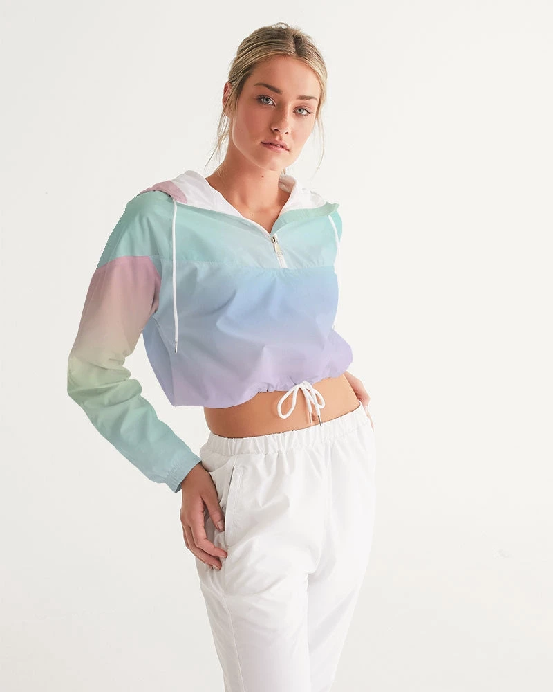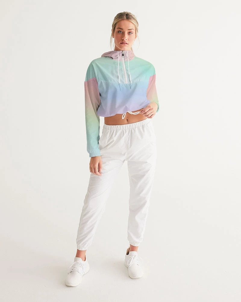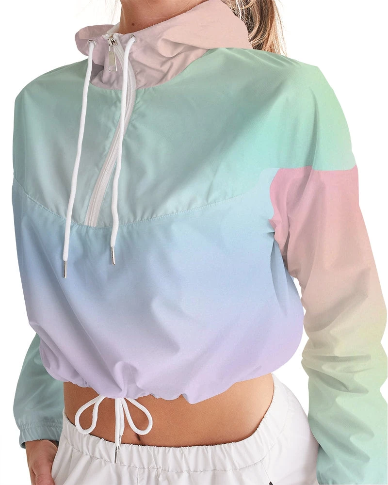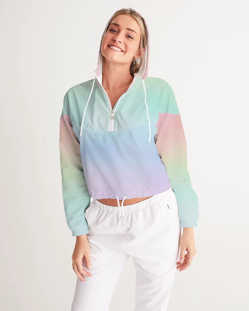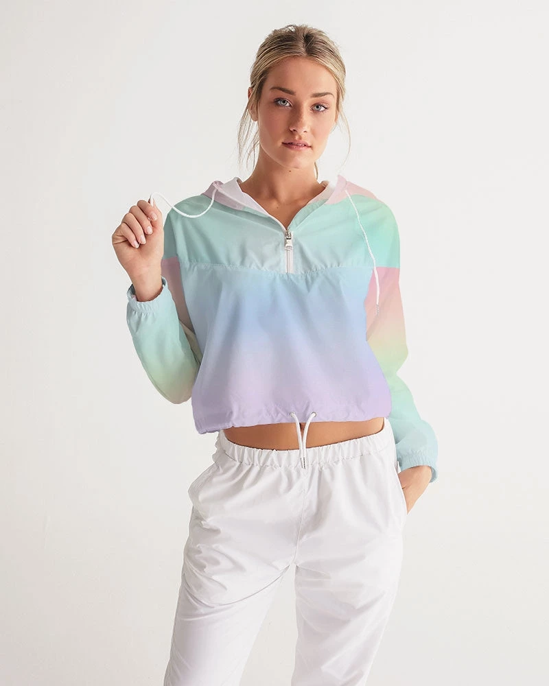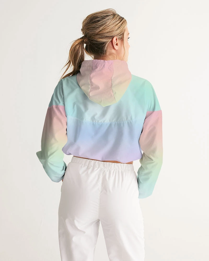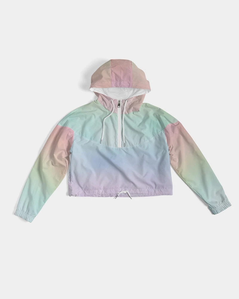 | Our Soft Rainbow Cropped Windbreaker features a subtle all over rainbow print. Made of lightweight, water-resistant fabric, this windbreaker has flexible styling options. Perfect with activewear, joggers, pants and jeans it is versatile enough to be worn out running, at the mall or a night on the town. Premium quality design with full lining. The pastel rainbow print turns and cold and dull day warm.