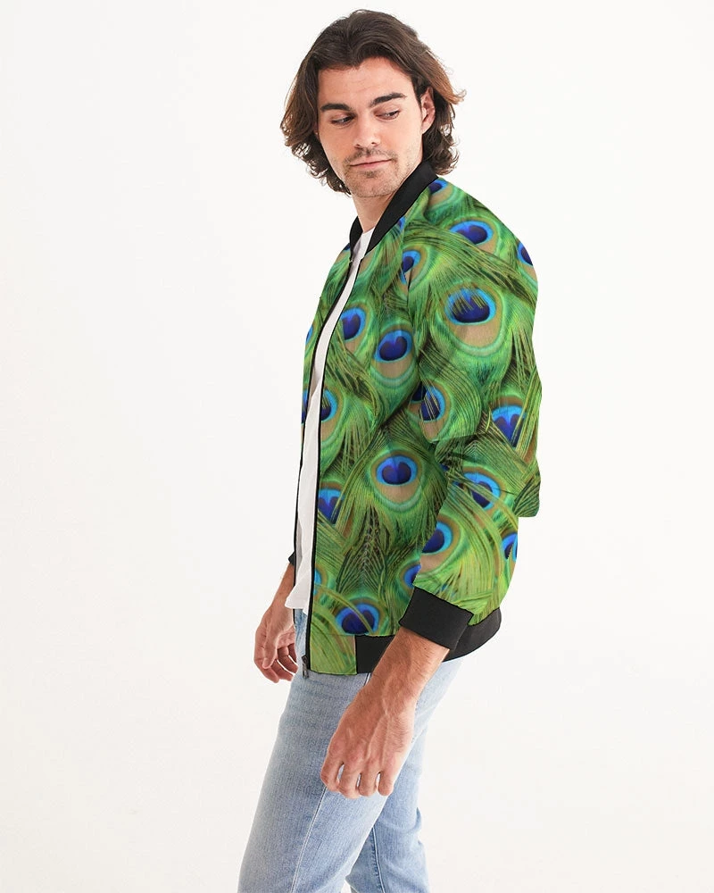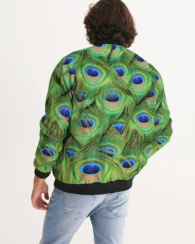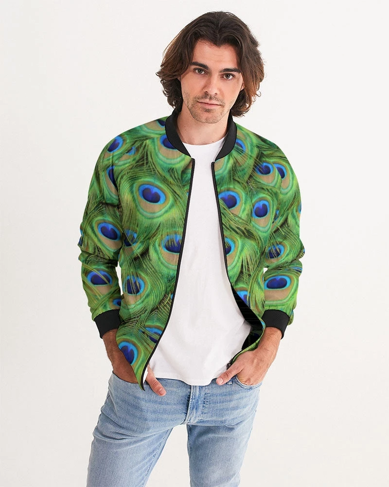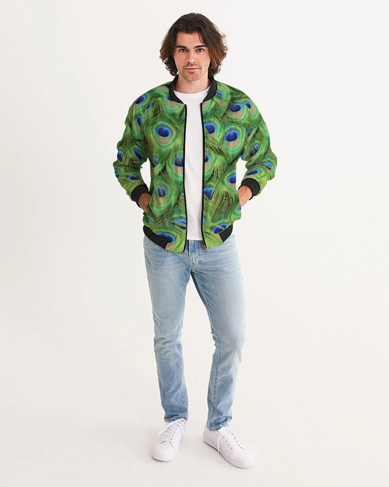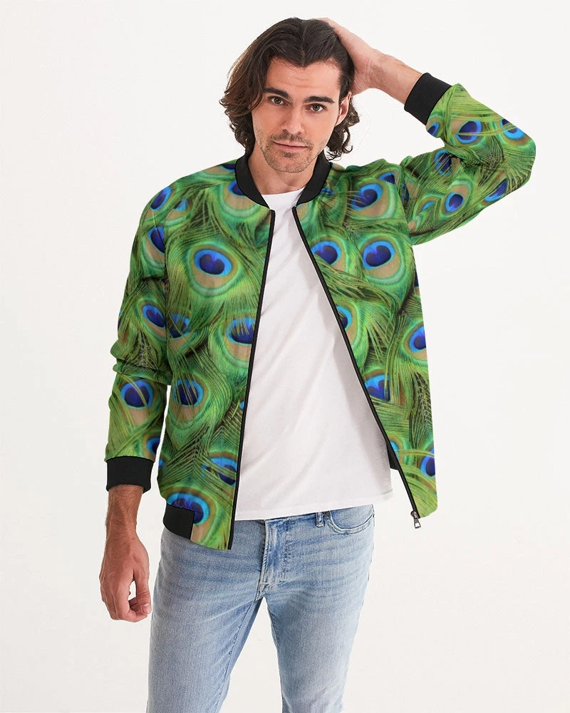 | Our Stunning Peacock Mens Bomber Jacket features an all over peacock feather print. Hand-cut and crafted with care, it will elevate your minimalist outfit to another level. Its lightweight, airy fabric is lined with the perfect amount of insulation for the chillier months making this a great year round go-to. A designer jacket you won’t find in the stores.