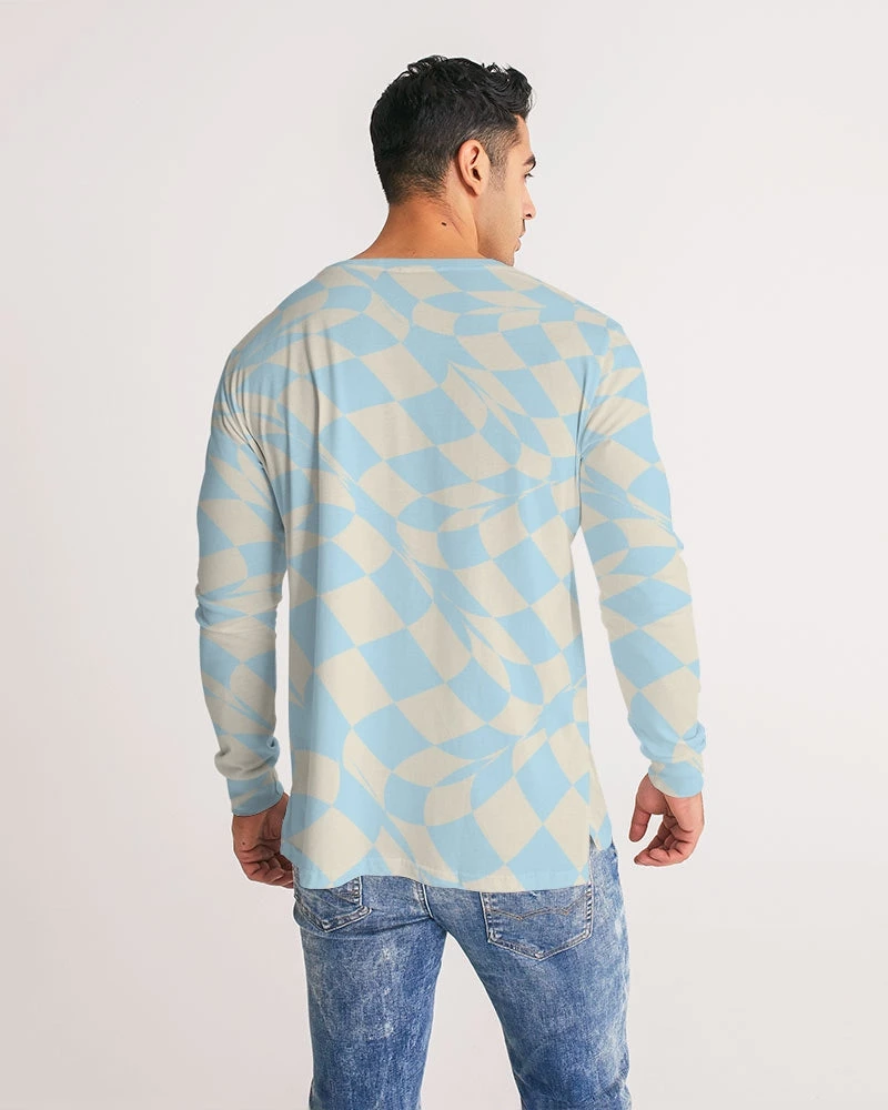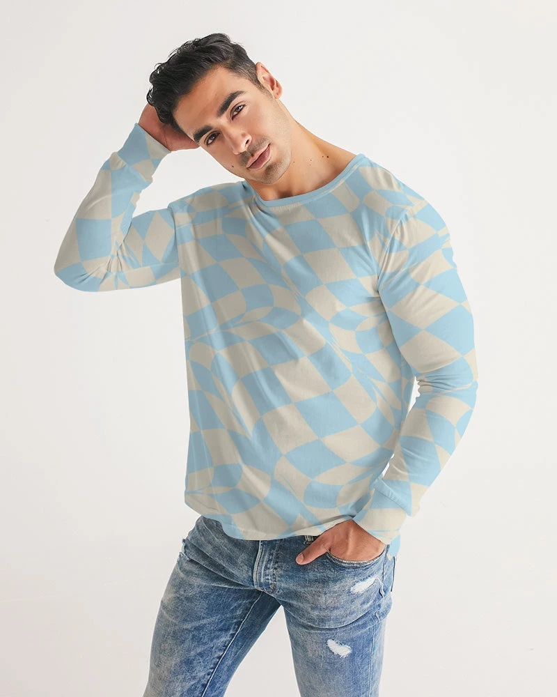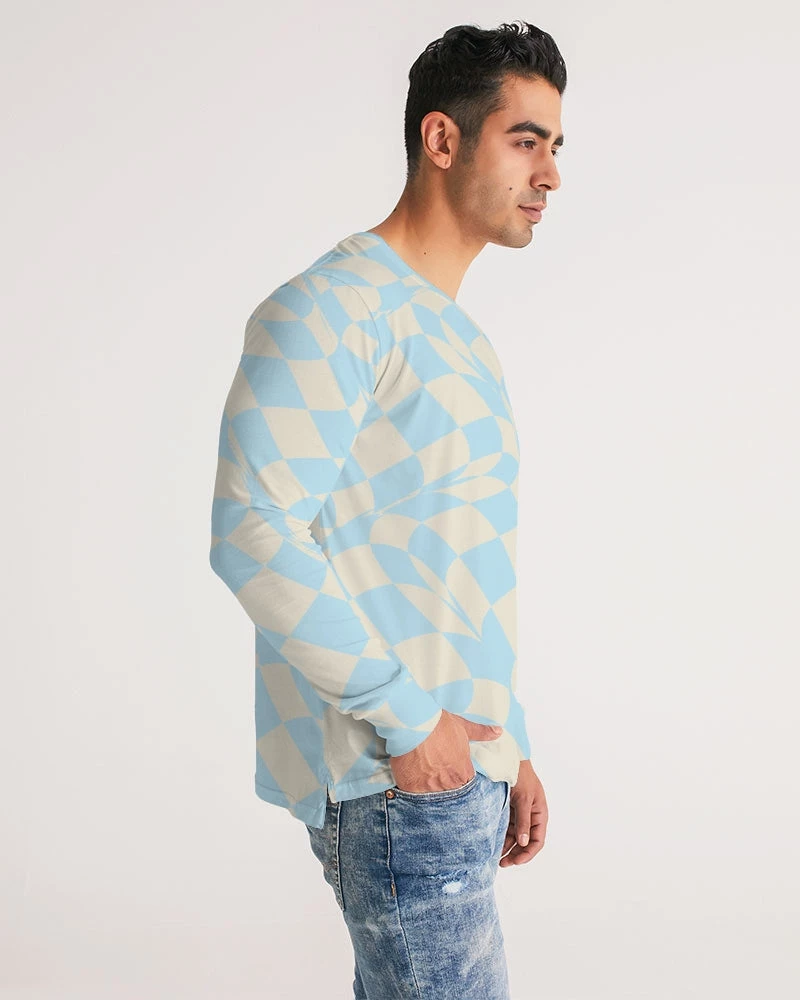 | Our Blue & Vanilla Ripple Check Long Sleeve Tee features an all over checker print in contemporary blue and cream vanilla. Perfect for the cooler months it is made of soft, breathable fabric for all day comfort. Its slim fit, straight hem and classic crew neck offer a seamless look that pairs well with jeans and pants, or under a jacket for a color pop.