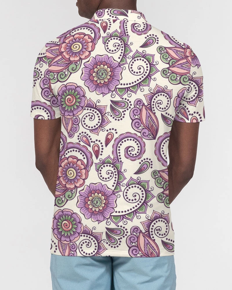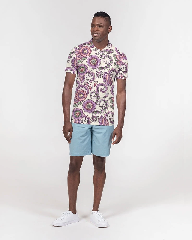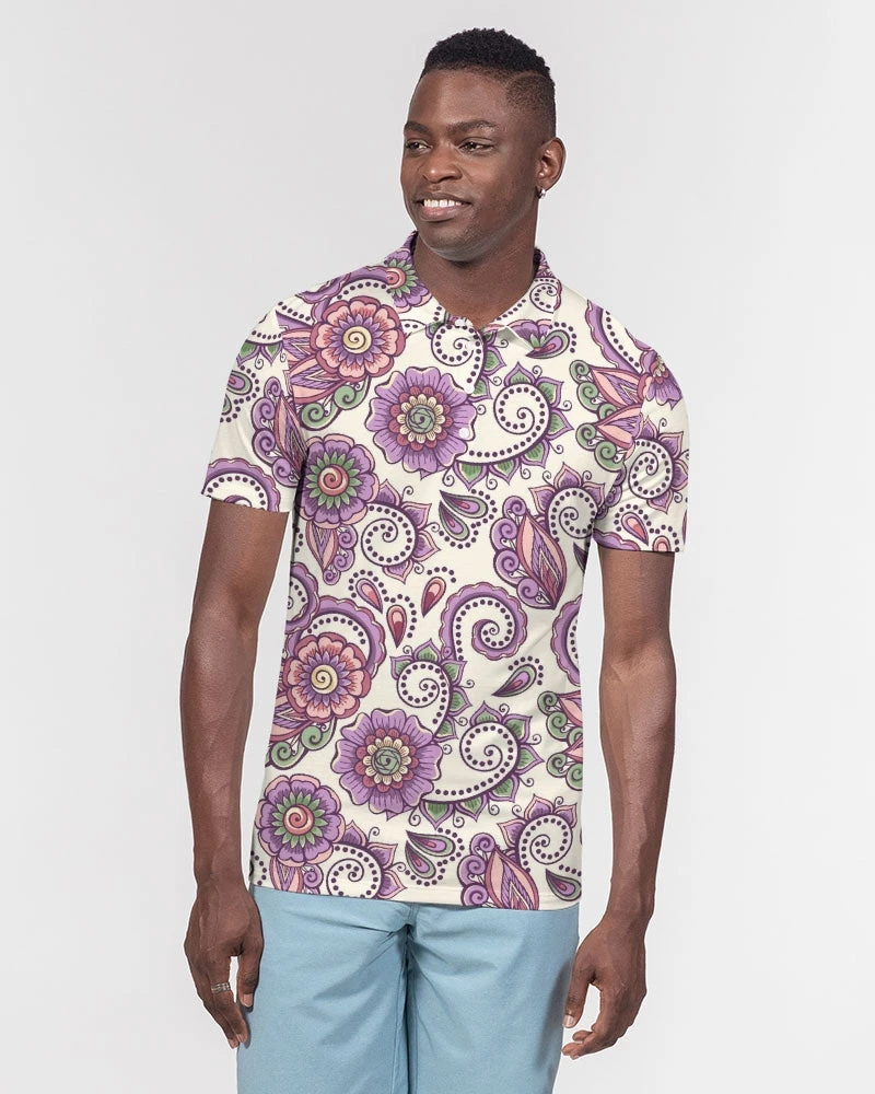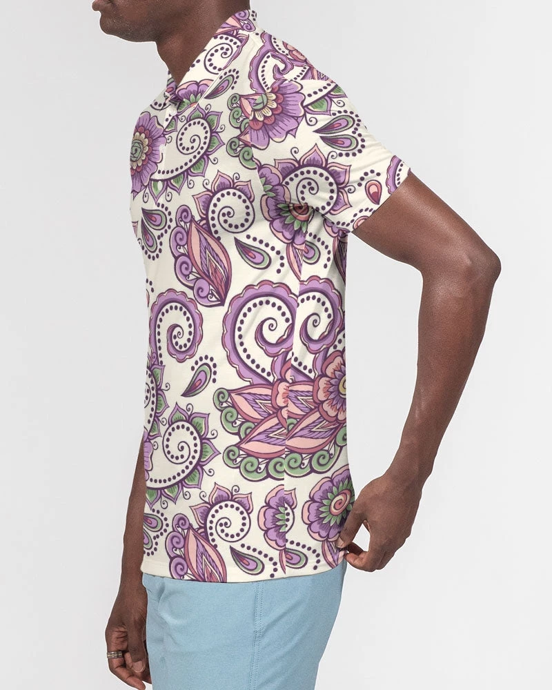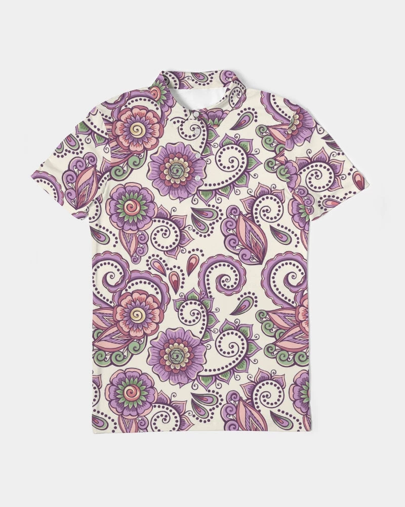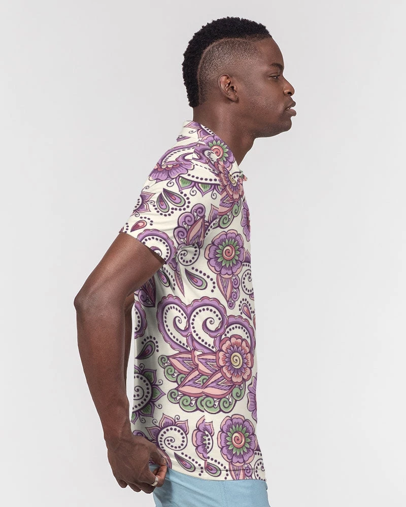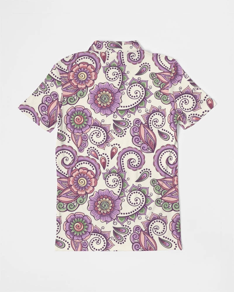| Our Purple Cream Paisley Polo is versatile enough for business casual or a polished weekender outfit. It features a soft, breathable fabric with a close cut torso, tailored to show your natural physique. Designed with a contemporary all over paisley print in purple and cream.
