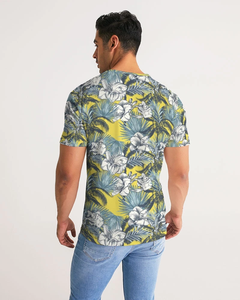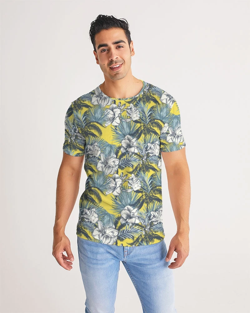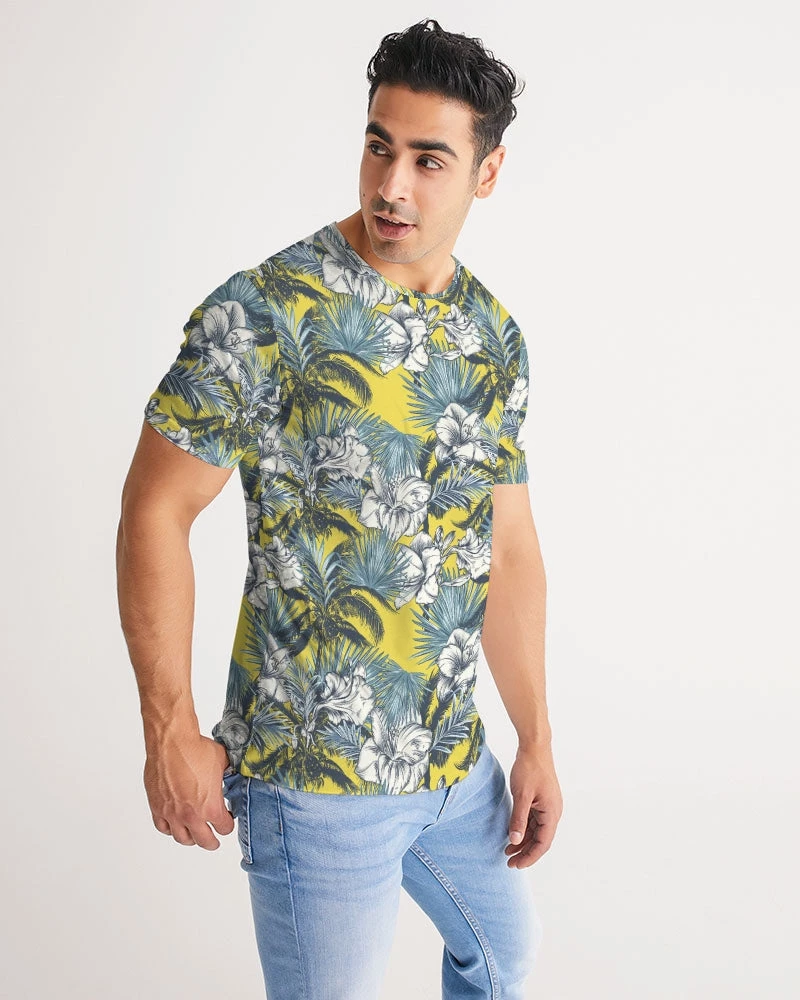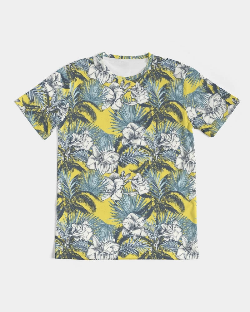 | Our Yellow Tropics Mens Tee features an all over palm and floral print. Handmade with premium wear resistant fabric, it works perfectly with jeans and shorts.