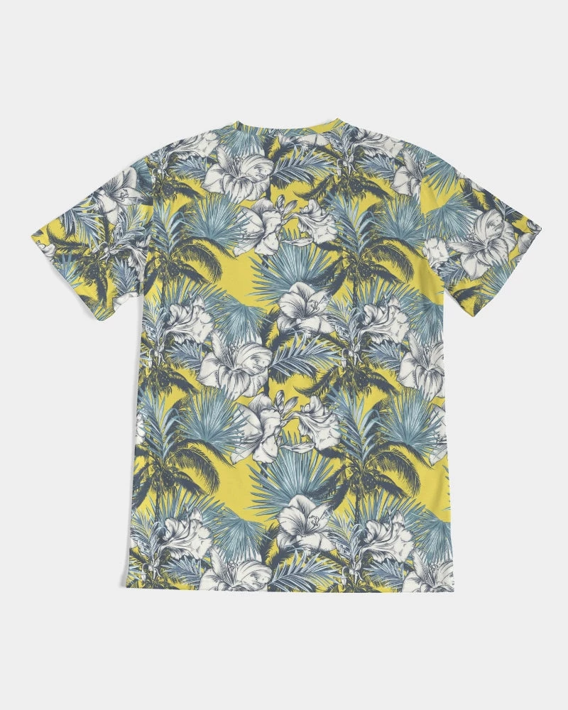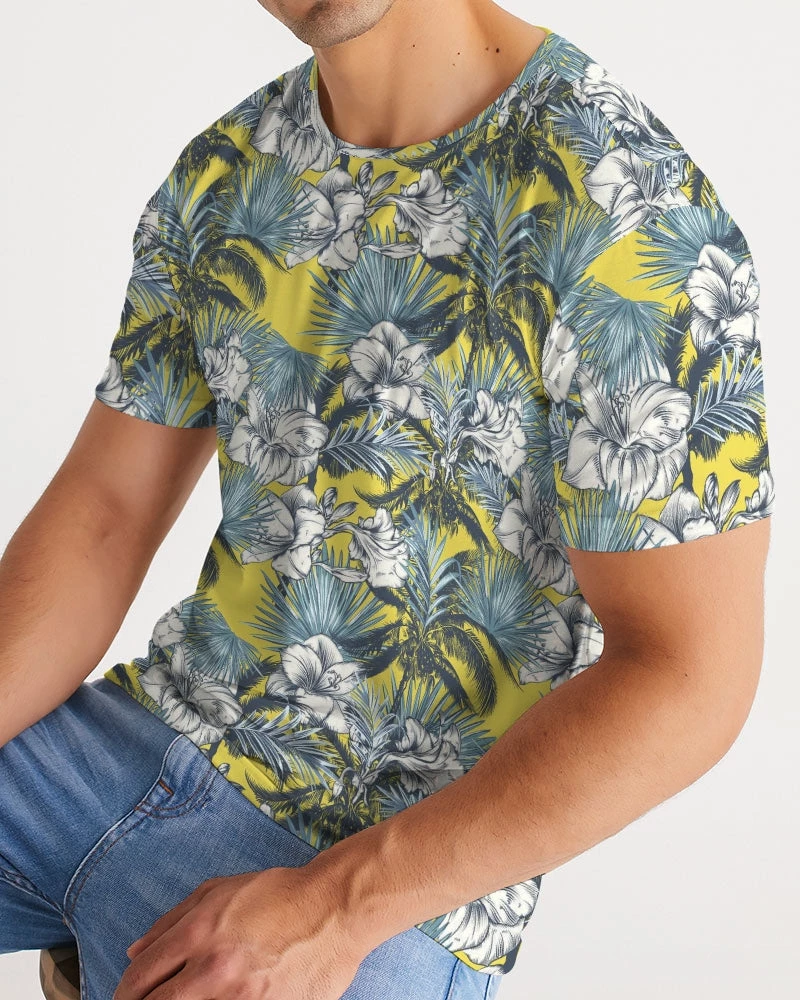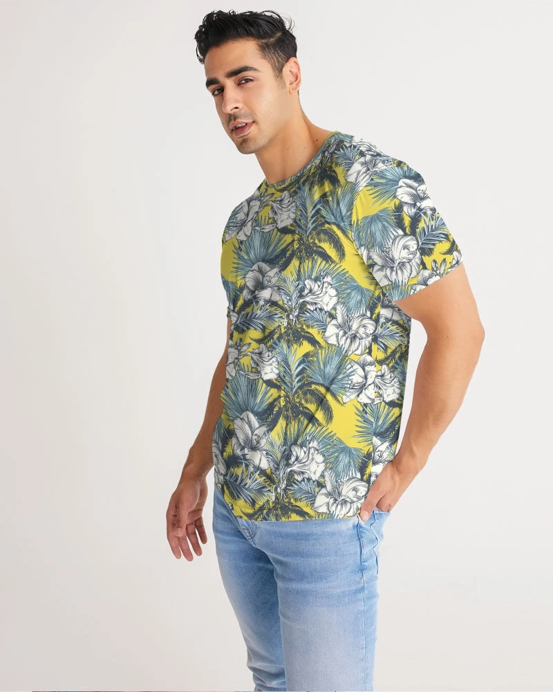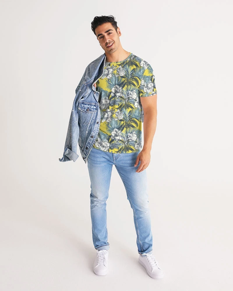 | Our Yellow Tropics Mens Tee features an all over palm and floral print. Handmade with premium wear resistant fabric, it works perfectly with jeans and shorts.