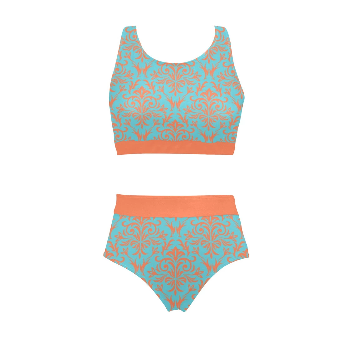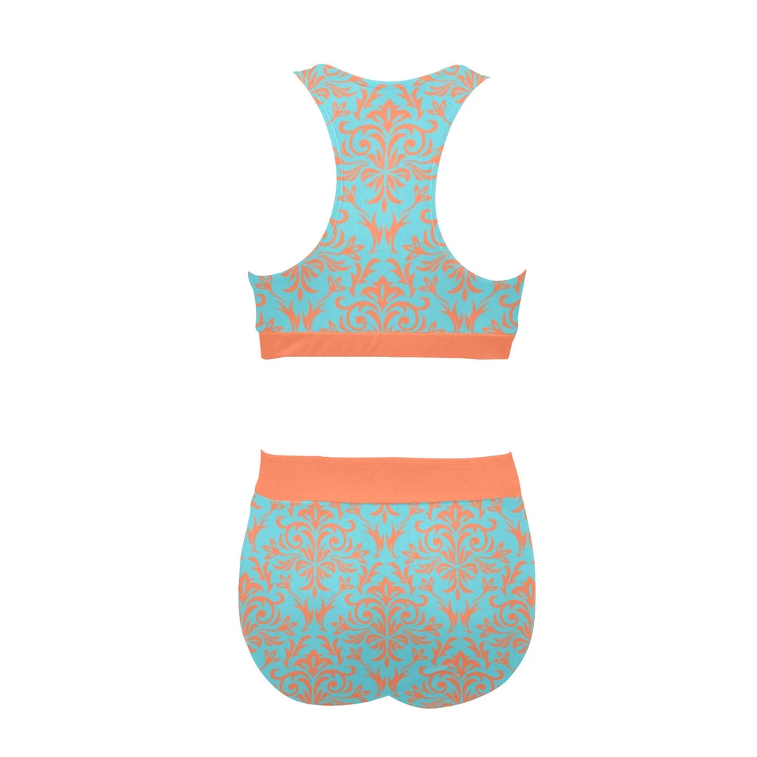 Our Vintage Motif Orange & Blue Sports Crop Top Bikini Set is one of a kind. This two piece set can be worn separately or together. The set features a sport crop top and high waisted bottoms. The soft blend fabric is comfortable with the right amount of stretch. The removable padded cups provide full coverage and support.